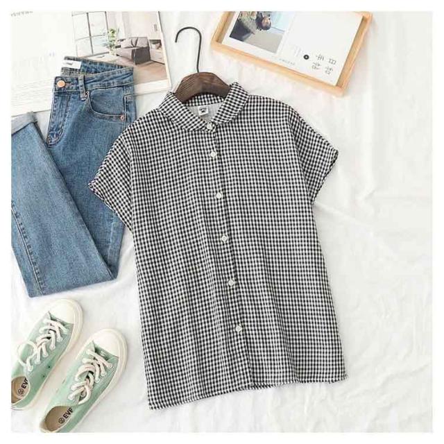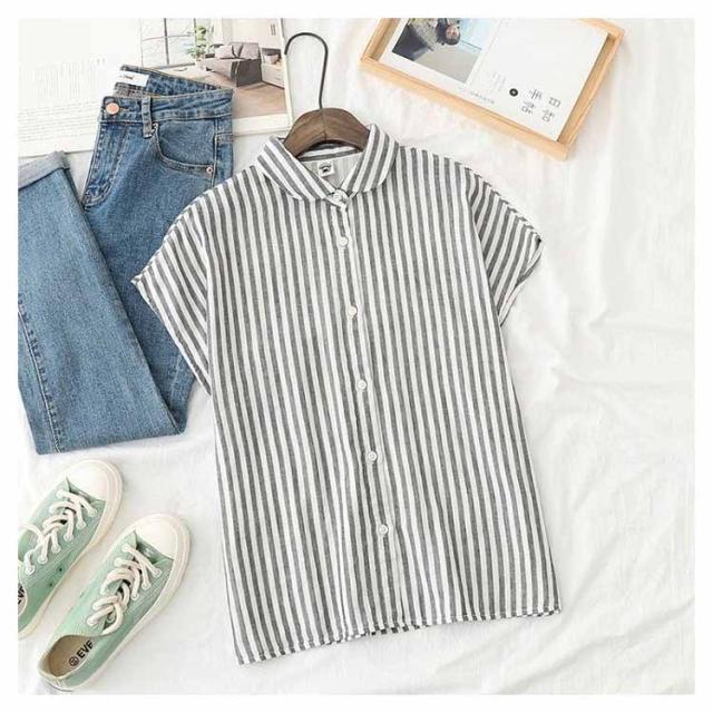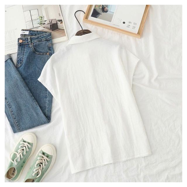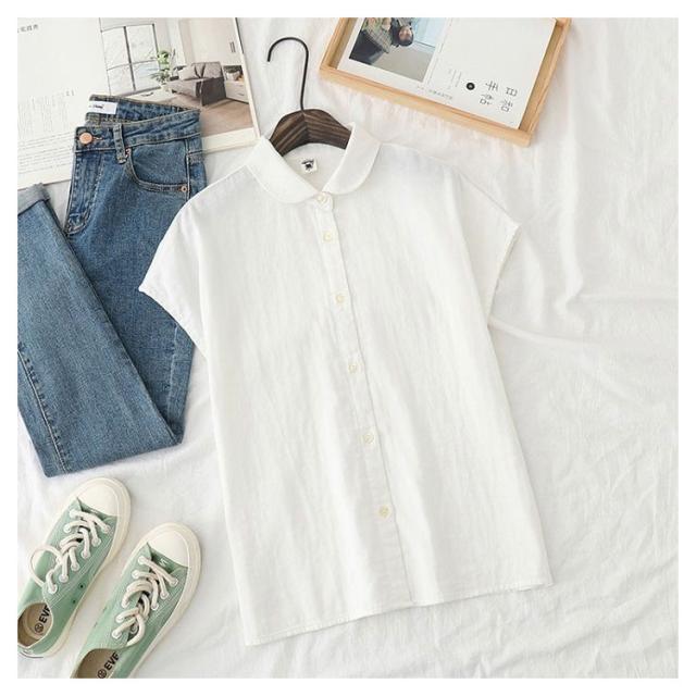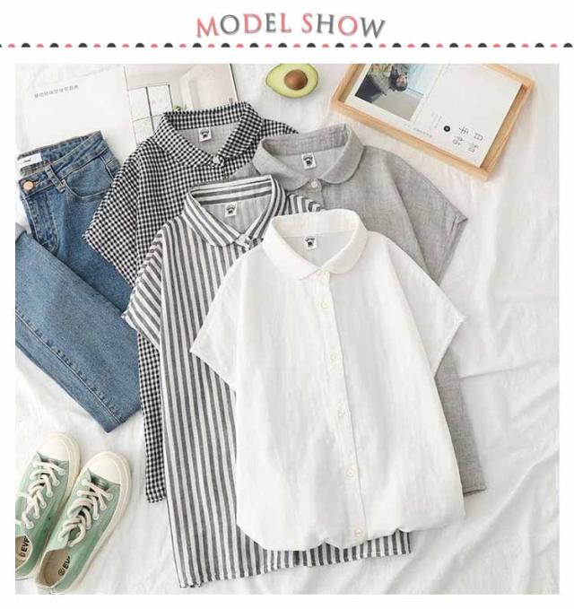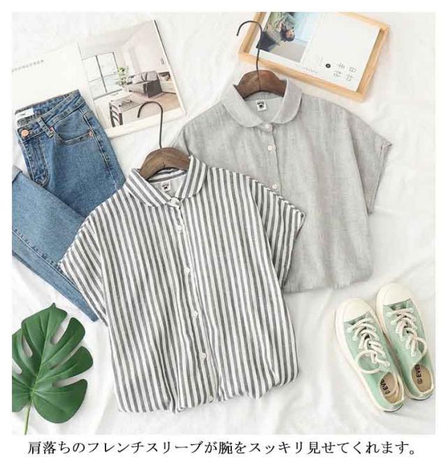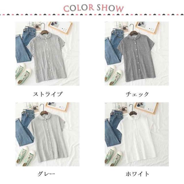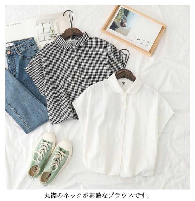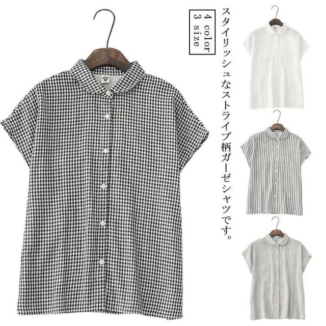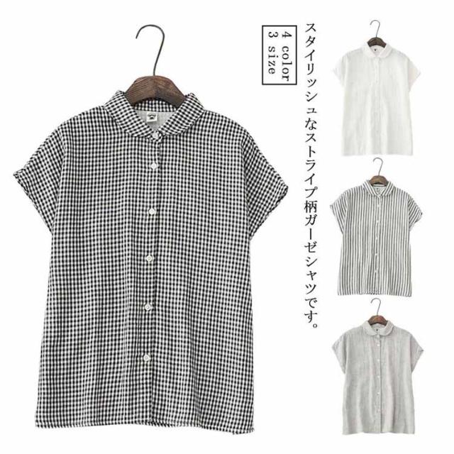 白シャツ レディース ブラウス 丸襟 トップス ストライプ チェック フレンチスリーブ 無地 コットン100% シャツ S M L 30代 40代 50代 女性用 ガーゼ トップス