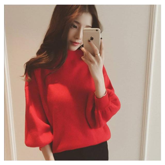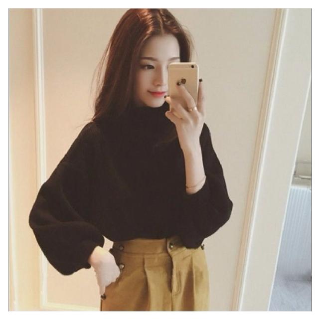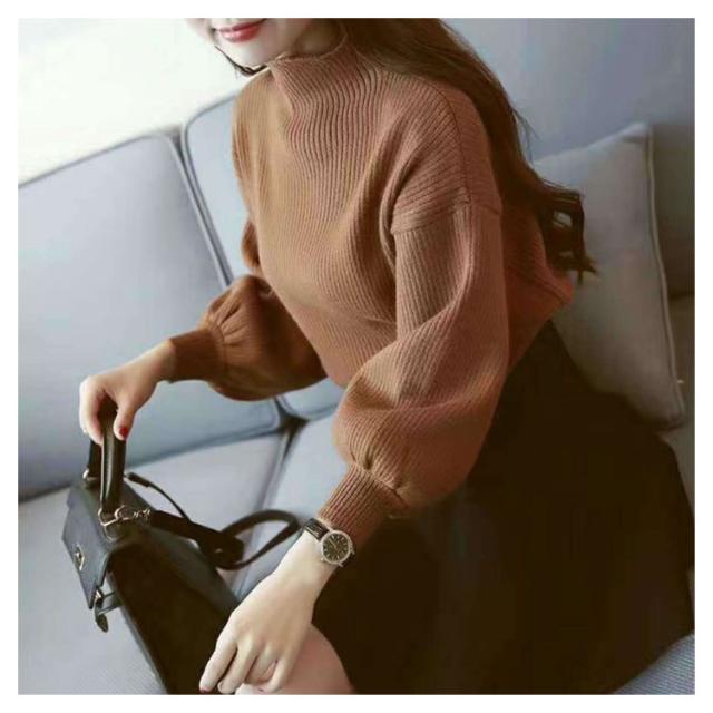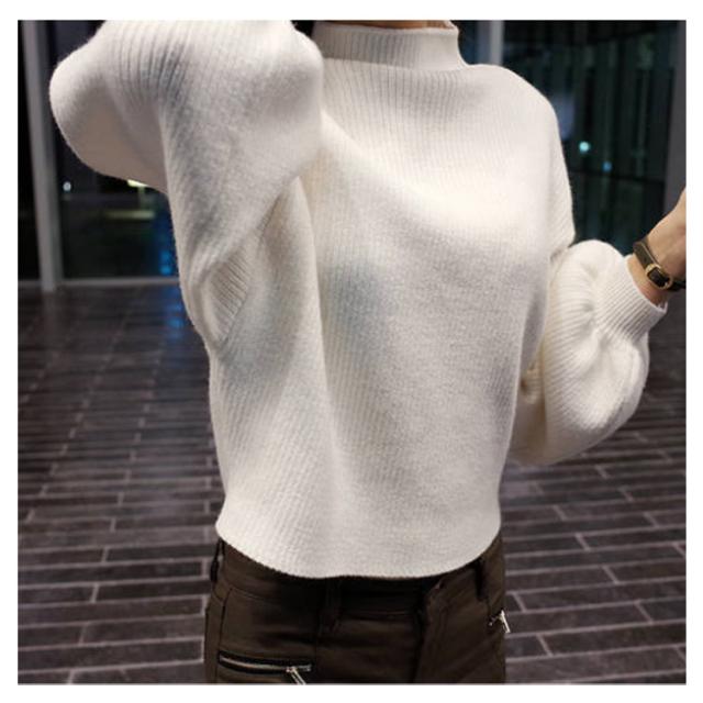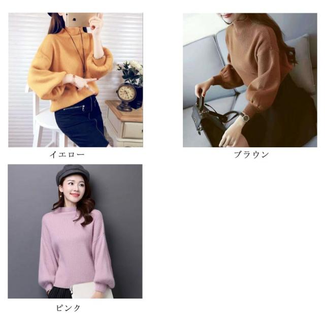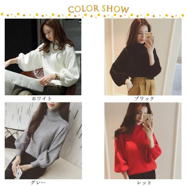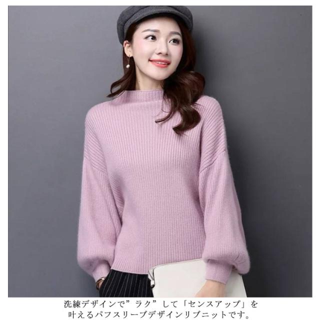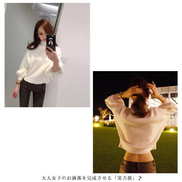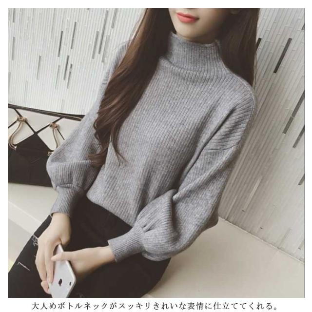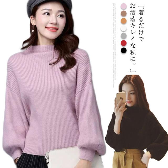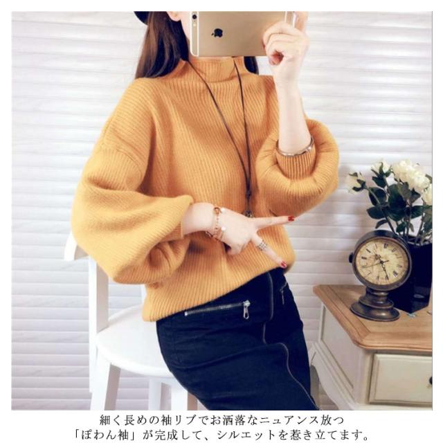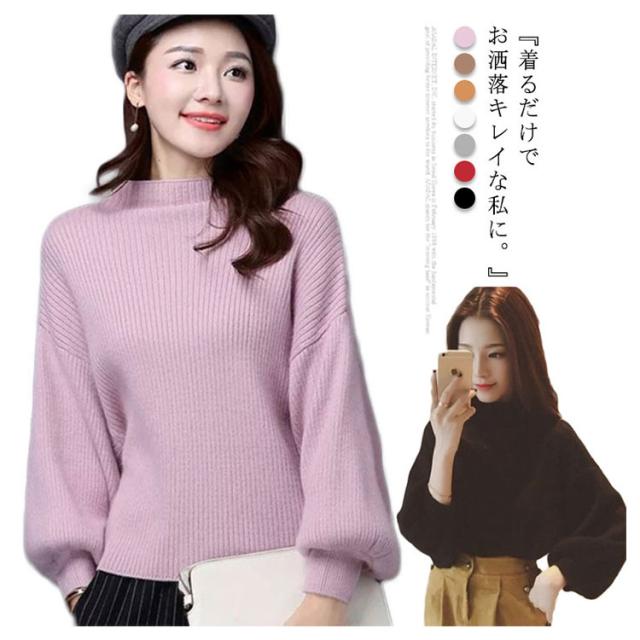 リブニット レディース セーター ニット ニットセーター ショート丈 ニットソー チュニック トップス プチハイネック トップス ハイネック ボトルネック 長袖 パフスリーブ シンプル 定番 着回し シルエット 無地