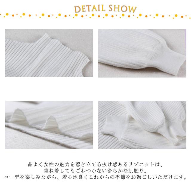 | 『着るだけでお洒落キレイな私に。』 大人女子のお洒落を完成させる「実力派」♪ 計算された絶妙なゆる感のリブニット。 大人めボトルネックがスッキリきれいな表情に仕立ててくれる。 細く長めの袖リブでお洒落なニュアンス放つ「ぽわん袖」が完成して、シルエットを惹き立てます。 品よく女性の魅力を惹き立てる抜け感あるリブニットは、重ね着してもごわつかない滑らかな肌触り。コーデを楽しみながら、着心地良くこれからの季節をお過ごしいただけます。 洗練デザインで”ラク”して「センスアップ」を叶えるパフスリーブデザインリブニットです。 | |