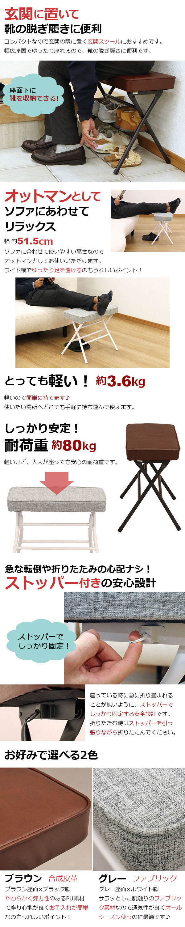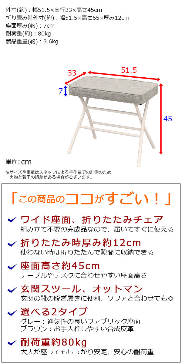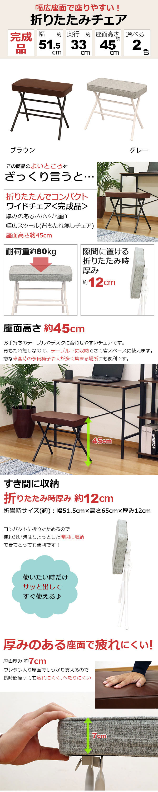 商品名:折りたたみチェア 座面が広い椅子 折りたたみ椅子 折り畳み キッチンチェア キッチン椅子 幅51.5cm 奥行33cm 座面高さ45cm 座りやすい スツール ダイニングチェア 玄関 ダイニングベンチ 玄関ベンチ 背もたれなし 作業用 ネイル用 靴収納 ブラウン グレー 完成品 単品 ワイド座面 折りたたみチェア チェア 座面高さ45cm 座面幅51.5cm ワイドチェア 1脚 単品 椅子 いす 折りたたみ 座厚 ワイド 幅広 玄関用 オットマン ダイニングチェア パソコンチェア 来客用 ダイニング ブラウン グレー コンパクト