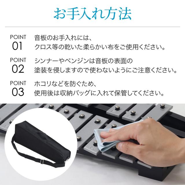 シンナーやベンジンは音板の表面の塗装を侵しますので使わないようにご注意ください。