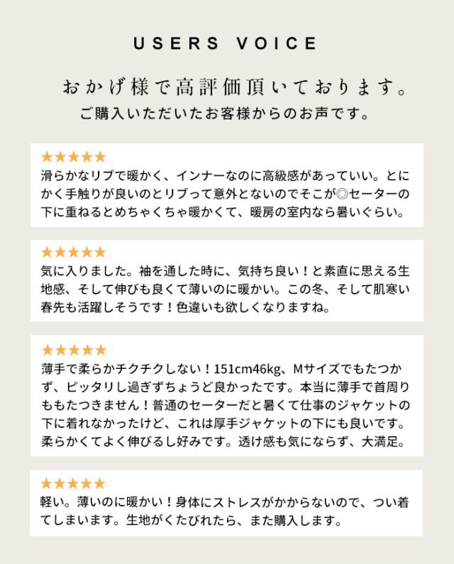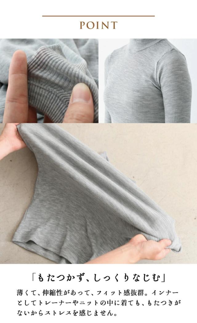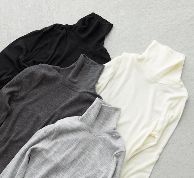 特徴 首元のチクチクが気になって、いつの間にか遠ざかっていたタートルネック。肌が喜ぶ大人仕様です。