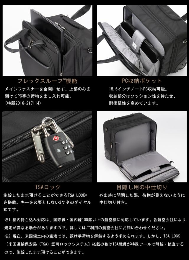 機能一覧:2輪/TSAロック/PC収納(15.6inch)/B4ファイル収納/国内100席以上・国際線機内持込み