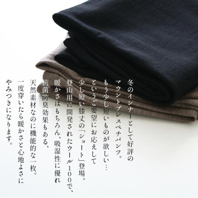 特徴 呼吸するウール。一度穿くとやめられない、冬の着こなしの強い味方。冬のインナーとして好評のマウントブレスペチパンツ。もう少し短いものが欲しい…というご要望にお応えして、少し短い膝丈の「ショート」登場。登山用に開発されたウール100で暖かさはもちろん、吸湿性に優れ、抗菌防臭効果もある、天然素材なのに機能的あ一枚。一度穿いたら暖かさと心地よさにやみつきになります。