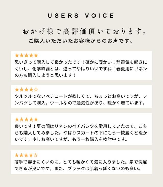 - 薄くしなやかです。 冬のインナーとしておすすめです。 寒さ厳しい北海道暮らしですが、スカート着用時のペチコートとして使用しましたが外出時でも暖かく過ごせました。 良い製品に出会えて幸せです。