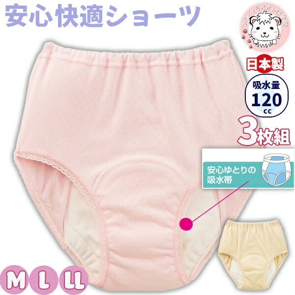 安心快適ショーツ 3枚組 抗菌 消臭 失禁 綿100% 日本製 吸水量120cc M/L/LL | 婦人用 失禁ショーツ 吸水ショーツ 安心 快適ショーツ ショーツ 介護用 入院 病院