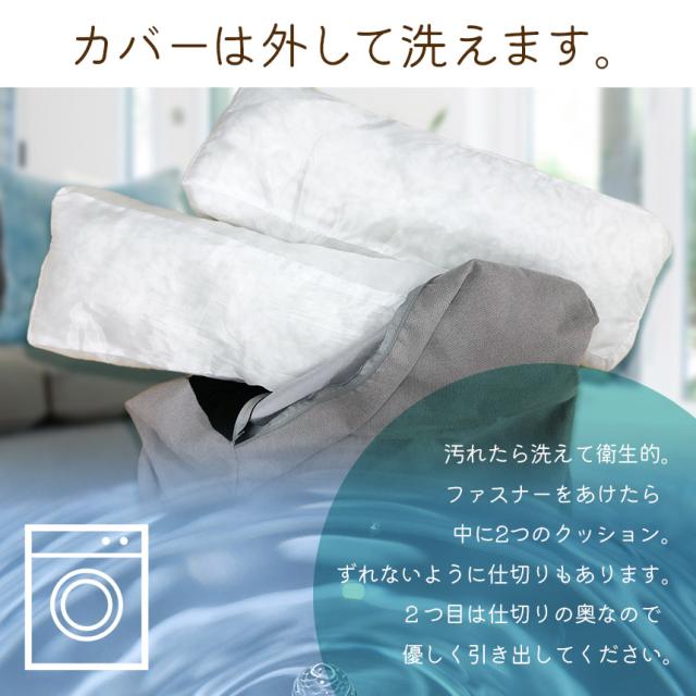 取り外し可能なカバーですので、ファスナーを開けて中の2つのクッションを取りだせます。カバーは汚れてもいつでもお洗濯して清潔に保つことができます。
