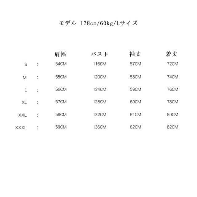 | サイズについての説明 | サイズ表 モデル 178cm/60kg/Lサイズ |