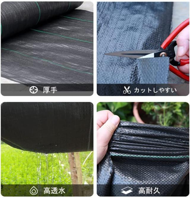 材質は耐候剤配合ポリプロピレン(UV耐候剤入り)なので高面密度90g/m?、破れにくく丈夫です。長い間敷き直しを不要にするために作った防草シートです。