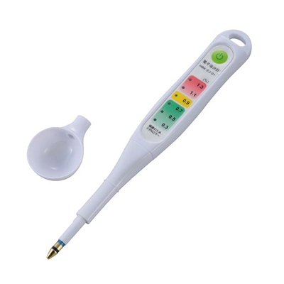 | 仕 様 | ■ 外形寸法: スプーンなし…(約)幅24 × 高さ191 × 奥行15 mm スプーン付き…(約)幅34 × 高さ206 × 奥行17 mm ■ 質量:31g(電池・スプーン共含む) ■ 検出方法:電導度測定方式 ■ 測定範囲: 0.3〜1.3%(誤差±0.2%) 0.3 0.5 0.7 0.9 1.1 1.3(以上)6段階LEDランプ表示 ■ 測定温度:10〜80℃ ■ 使用温度範囲:10〜40℃ ■ 主な材質: 本体…ABS樹脂 先端部…センサー/鉛レス黄銅に金メッキ処理 Oリング/ポリプロピレン(PP)(先端部 耐熱100℃) ■ 付属品:取扱説明書(保証書1年付き)、スプーン1個、動作確認用ボタン電池(LR44×3個) |