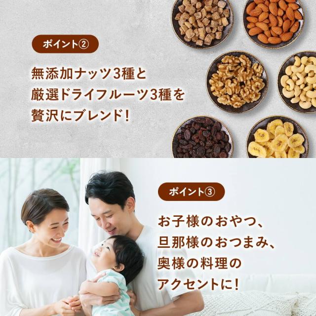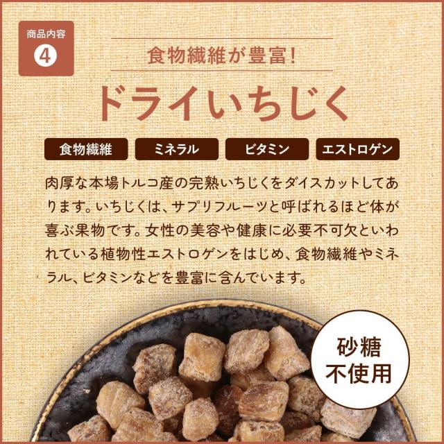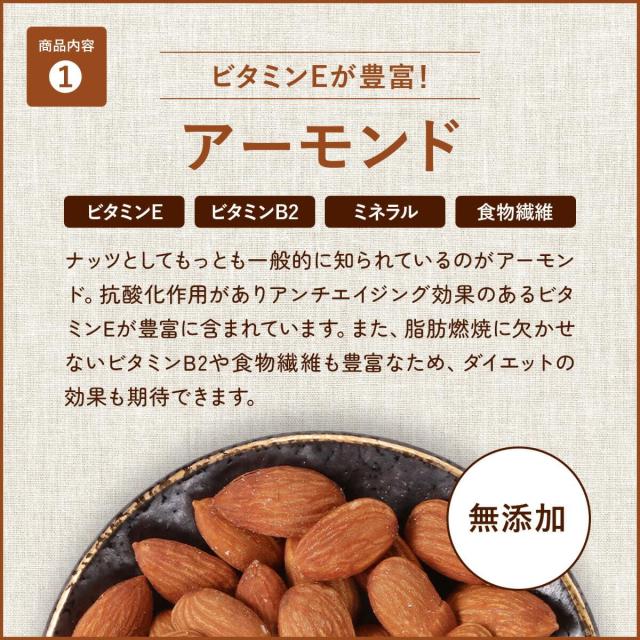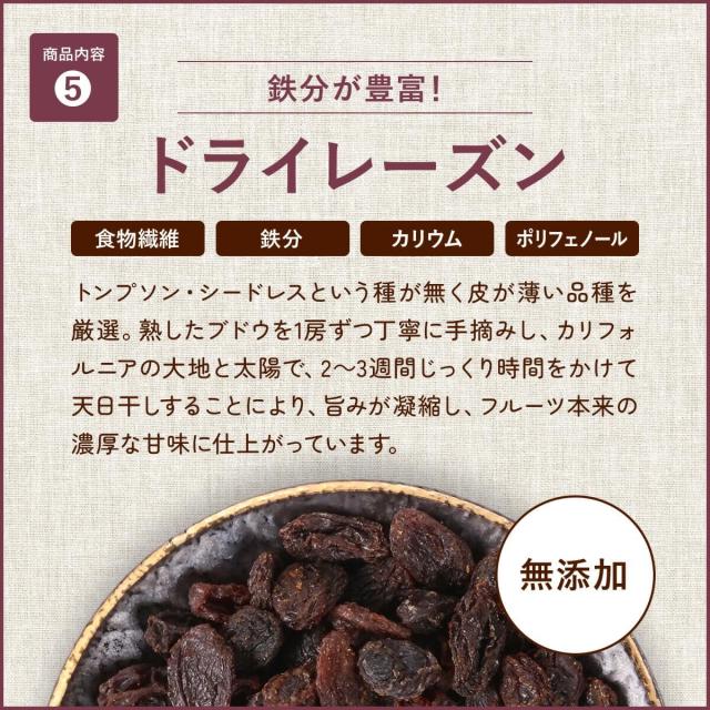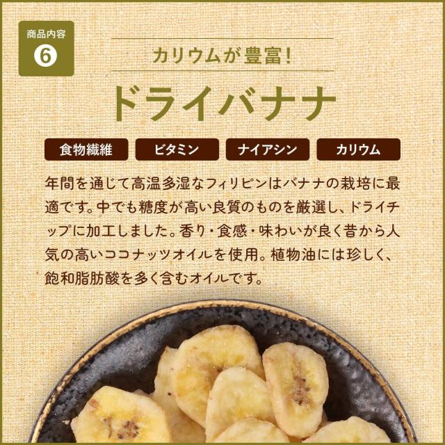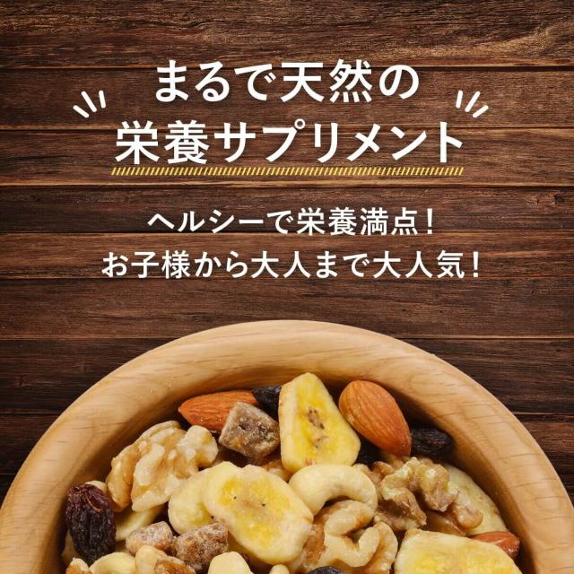 ≪原材料名≫アーモンド(アメリカ産)、カシューナッツ(インド産)、クルミ(アメリカ産)、バナナチップ(フィリピン産/ココナッツオイル、砂糖/香料)、ドライレーズン(アメリカ産)、ドライクいちじく(トルコ産)