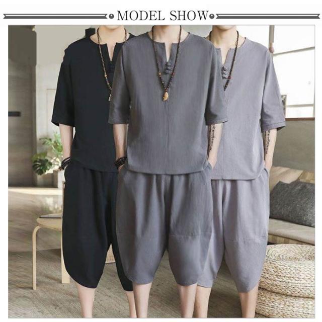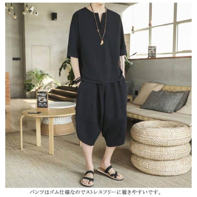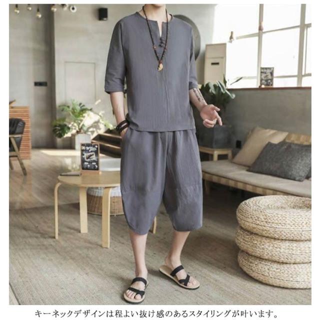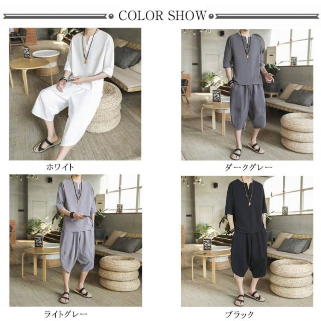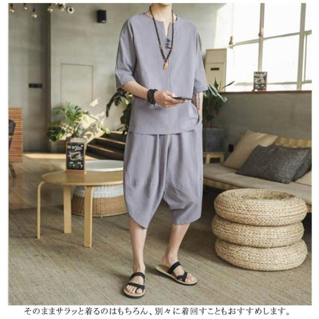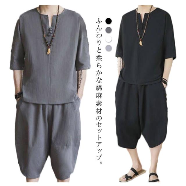 (送料無料)綿麻上下セット セットアップ メンズ 半袖カットソー tシャツ ワイドパンツ サルエルパンツ キーネッククロップド 七分丈 リネン混 父の日 プレゼント ギフト