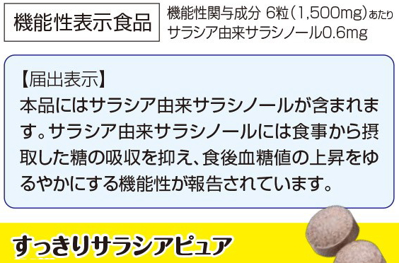 機能性表示食品。2粒にサラシアエキス粉末100mg配合。1粒250mgと小粒ですので、飲み易くなっております。6粒(1500mg)あたり、サラシア由来サラシノール0.6g配合。粒タイプですので、お身体の調子に合わせて、飲む量を調節いただけます。
