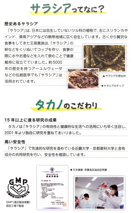 【内容量】250mg×60粒【原材料】サラシアエキス末(サラシア属植物抽出エキス)、ナタネ油脂末、デンプン/セルロース、環状オリゴ糖、ビタミンC、CMC-C【区分】日本製・機能性表示食品【メーカー名】タカノ株式会社
