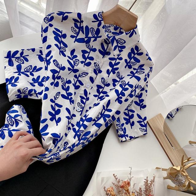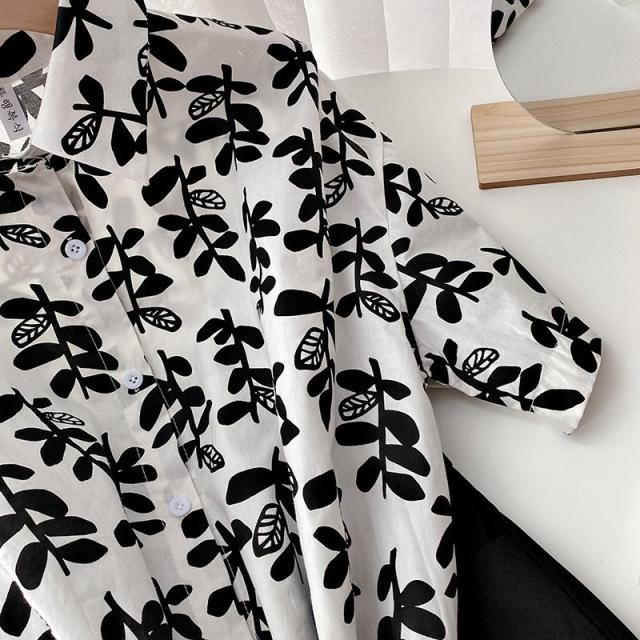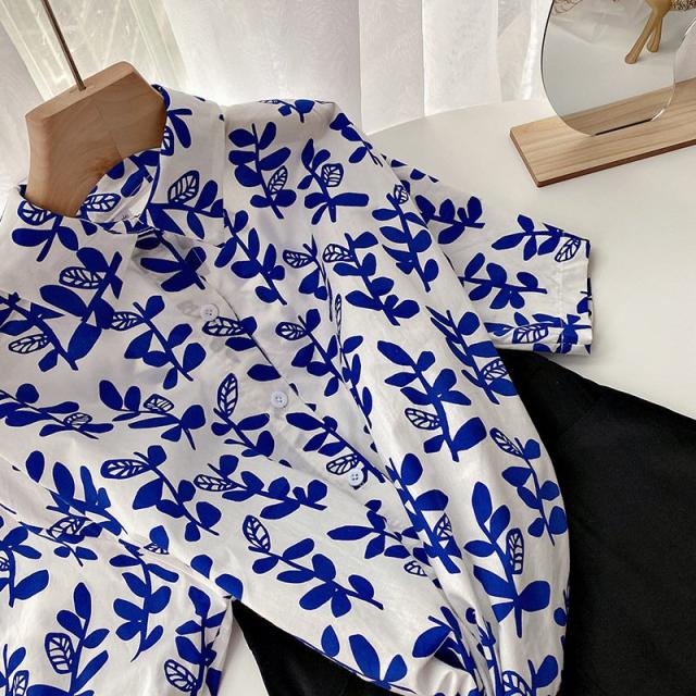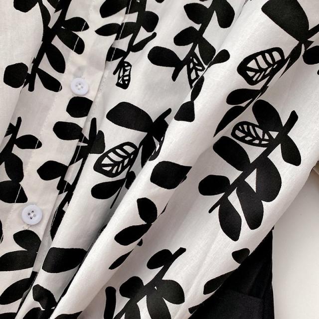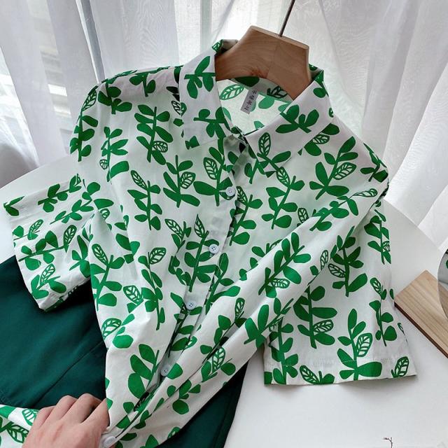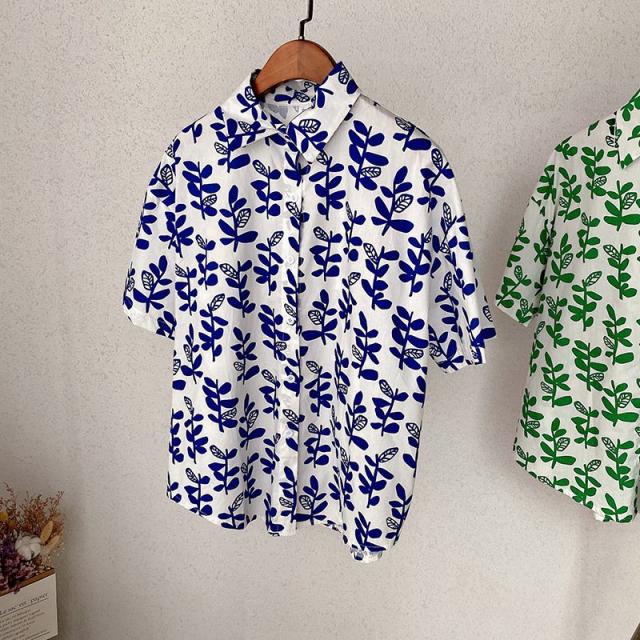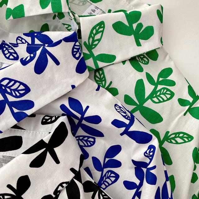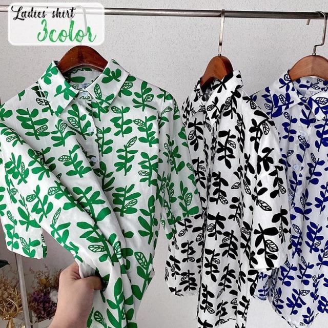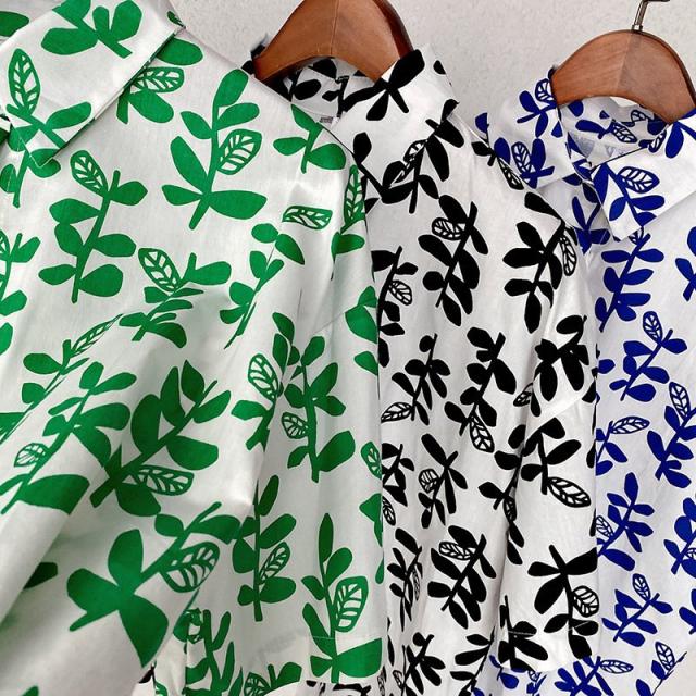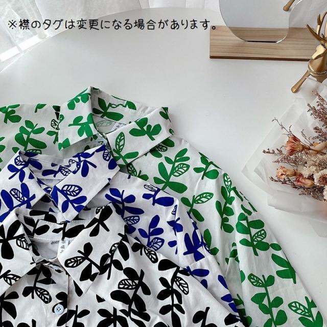 シャツ チュニック 半袖 レディース 女性 トップス スタンダードカラー リーフ 葉 プリント入り 総柄 前開き 前ボタン ミディアム丈 カジュアル