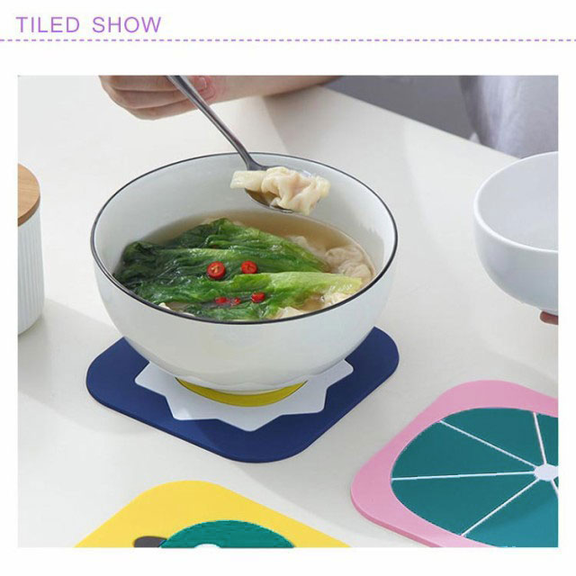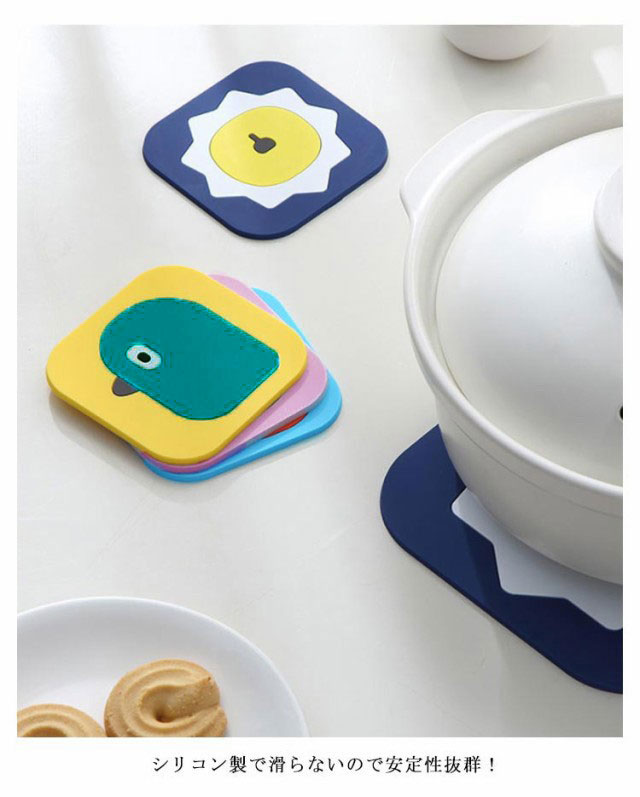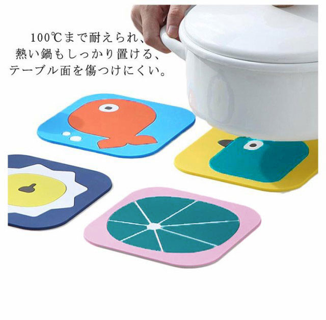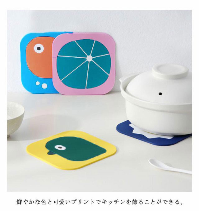 | 100℃まで耐えられ、熱い鍋もしっかり置ける、テーブル面を傷つけにくい。 シリコン製で滑らないので安定性抜群! 油などで汚れた場合は、水で洗うだけできれいになり、お手入れ簡単。 柔らかく耐久性があり、長時間使用しても変形しない。 鮮やかな色と可愛いプリントでキッチンを飾ることができる。 | |