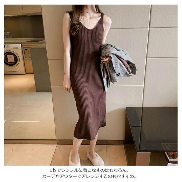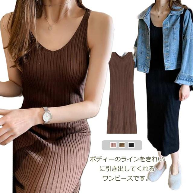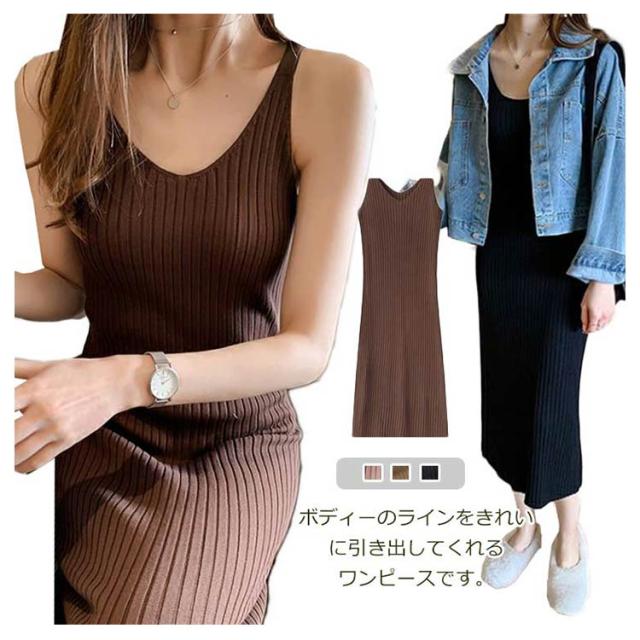 送料無料 ニットワンピース タイト ノースリーブ ロングワンピース キャミワンピ レディース リブ ニット シンプル ワンピース セクシー ロング丈 後スリット エレガント 春 夏 秋
