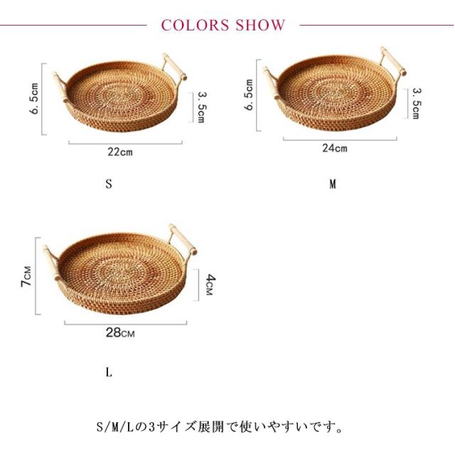 | 天然素材のラタンを編み込んだトレイ。 バスソルトを入れて装飾用、来客時にお菓子をお出しするなどに最適。 S/M/Lの3サイズ展開で使いやすいです。 取っ手付きなので持ち運びもラクラク。 可愛くてディスプレイにピッタリ、飾るプレートとしても。 | |