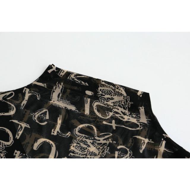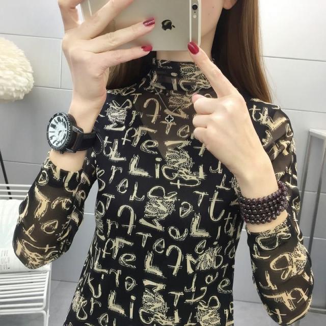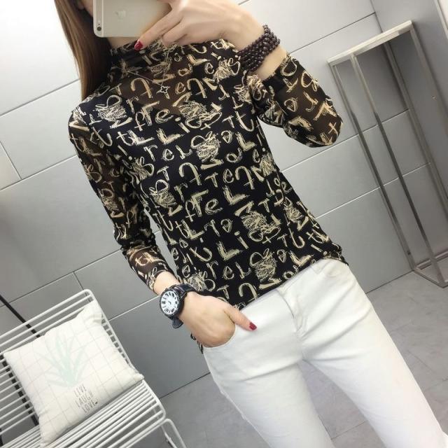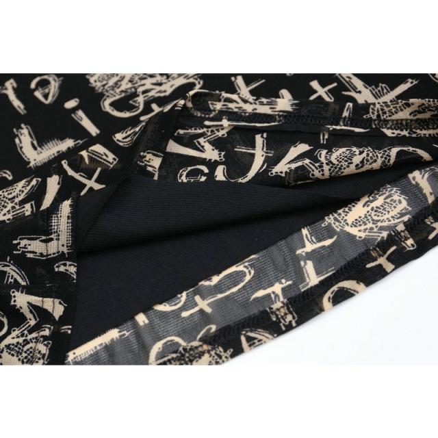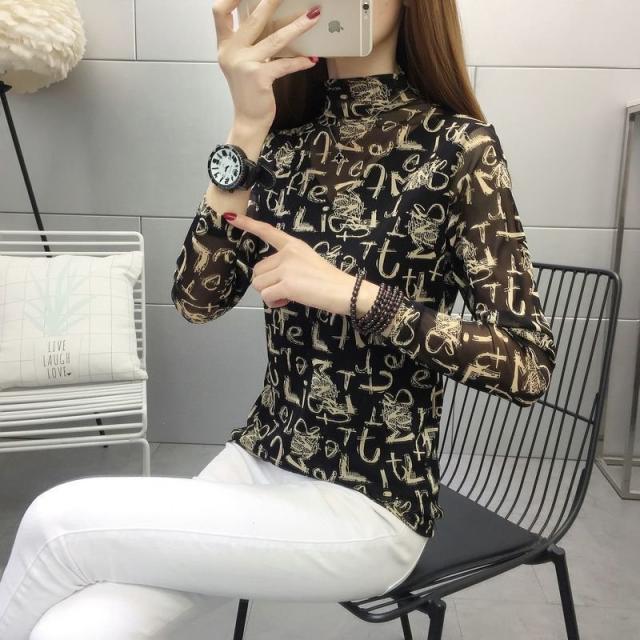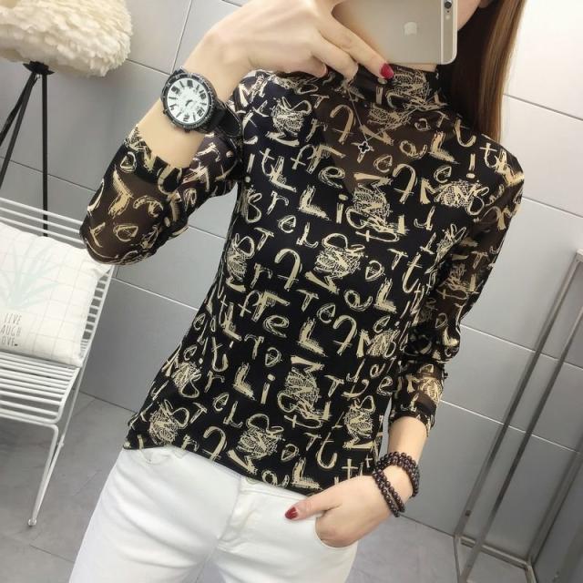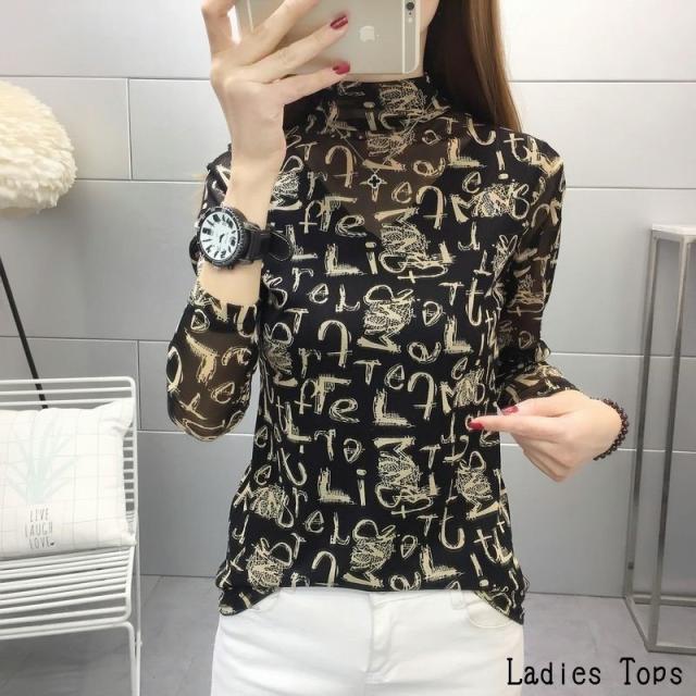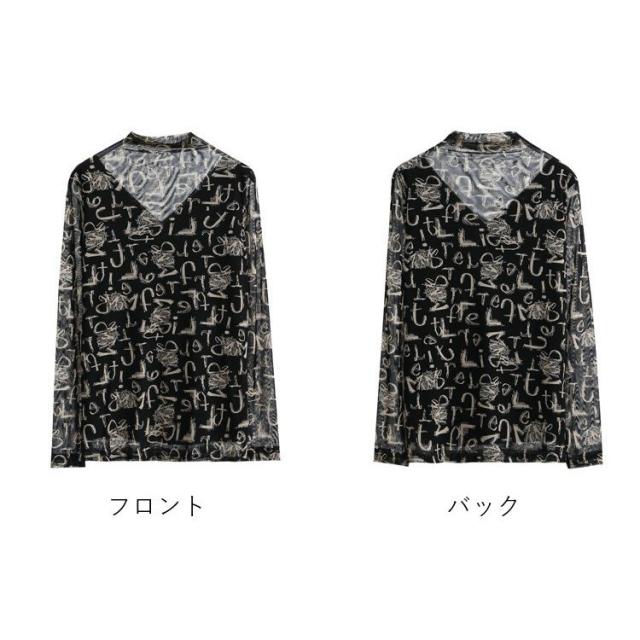 カットソー レディース 女性 トップス 長袖 ハイネック 薄手 シースルー 総柄 アルファベット ブラック カジュアル 華やか きれい おしゃれ シッ