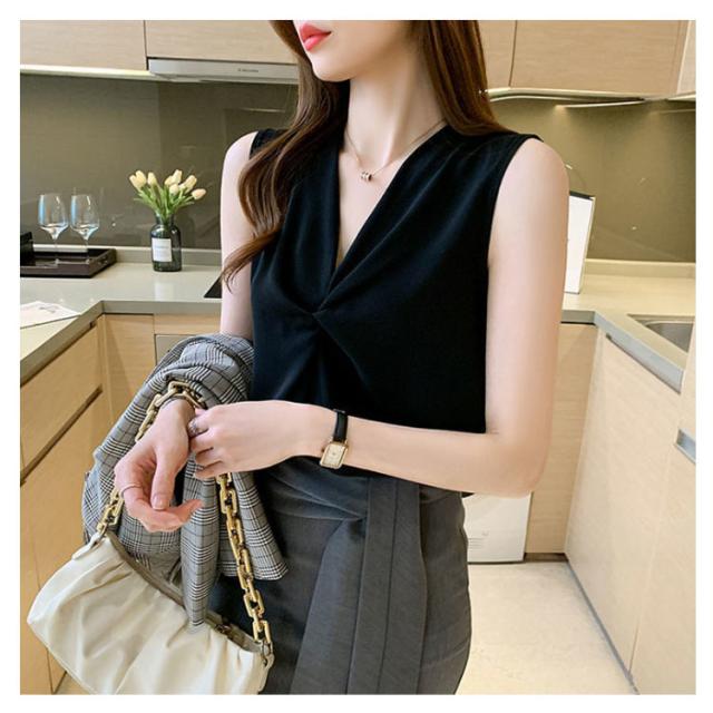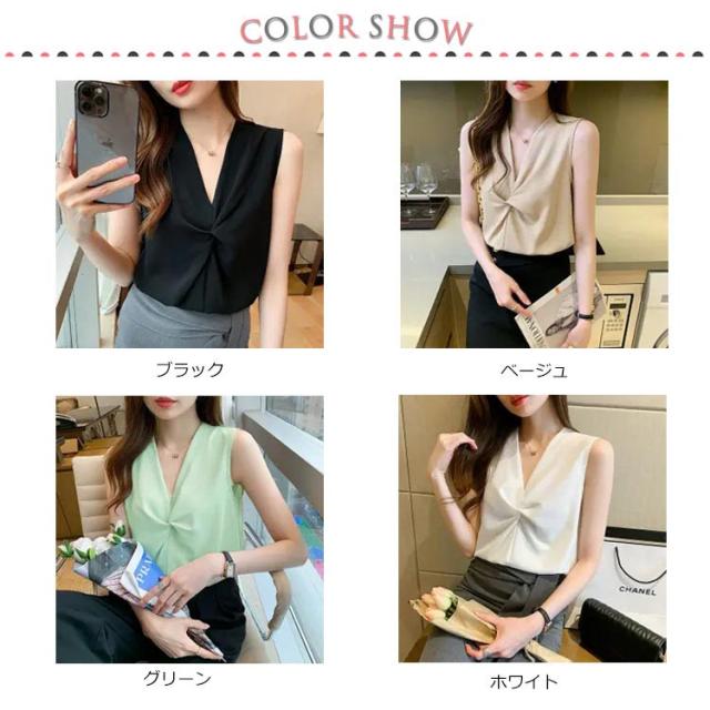 送料無料 トップス レディース ノースリーブ 胸 フリル リボン シフォン Vネック シフォンブラウス きれいめ 黒 白 緑 ベージュ 韓国ファッション カットソー レディース スーツ インナー