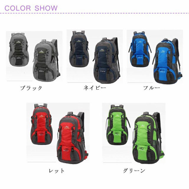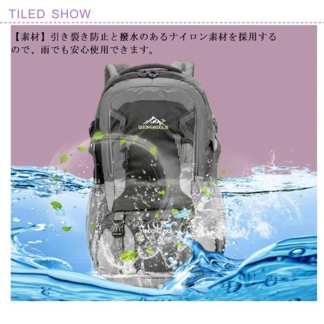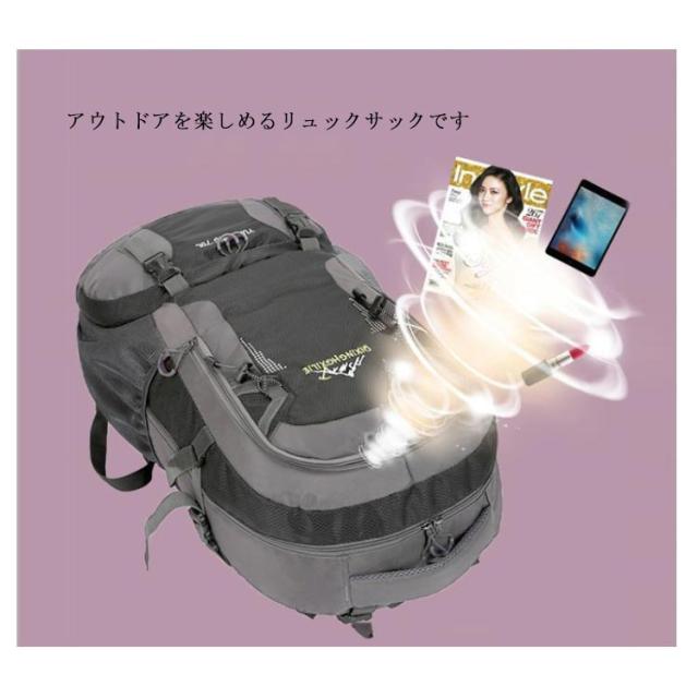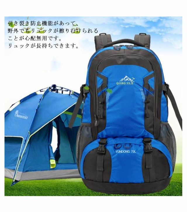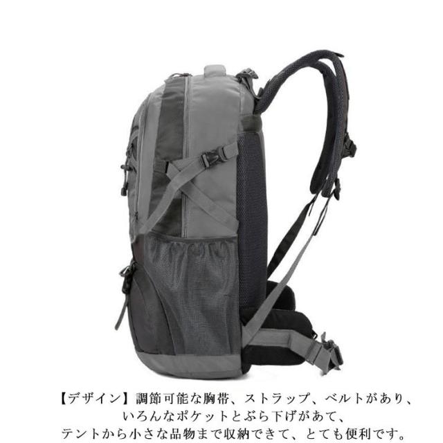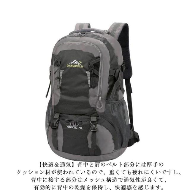 | (軽量&耐荷重抜群)容量が勿論、耐荷重性も抜群です。アウトドアを楽しめるリュックサックです。 (素材)引き裂き防止と撥水のあるナイロン素材を採用するので、雨でも安心使用できます。引き裂き防止機能があって、野外でもリュックが擦りむけられることが心配無用です。リュックが長持ちできます。 (デザイン)調節可能な胸帯、ストラップ、ベルトがあり、いろんなポケットとぶら下げがあて、テントから小さな品物まで収納できて、とても便利です。 (快適&通気)背中と肩のベルト部分には厚手のクッション材が使われているので、重くても疲れにくいですし、背中に接する部分はメッシュ構造で通気性が良くて、有効的に背中の乾燥を保持し、快適感を感じます。 | |