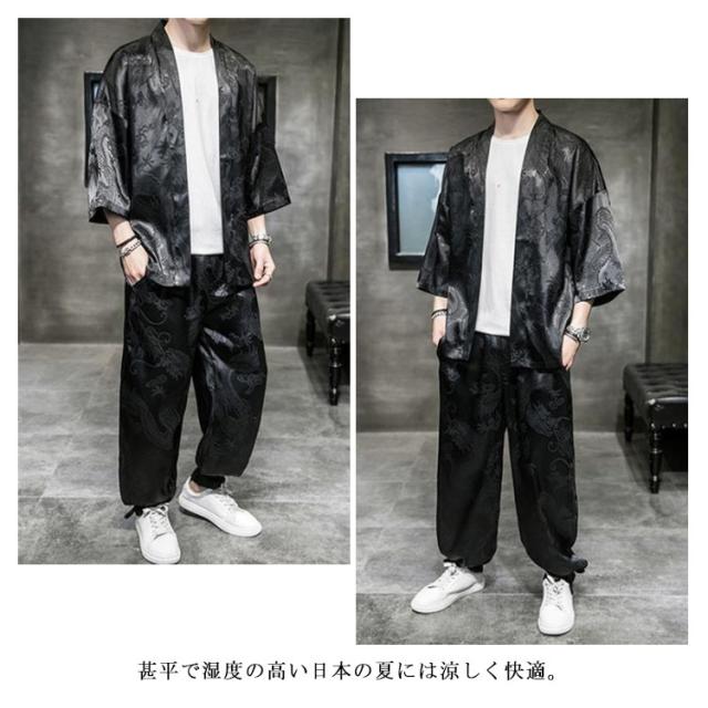 | しじら織り甚平のです! 甚平で湿度の高い日本の夏には涼しく快適。 年代問わず夏のイベントなどの遊び着やルームウェアとして着用していただける和装です。 脚口は縛っていて、生地は肌離れが良くサラサラしたしじら織りの生地を使用し、さらに快適な甚平です。 サマーシーズンをより快適に、より楽しくお過ごし頂けるオススメのしじら総柄の竜模様甚平上下セットです。 | |