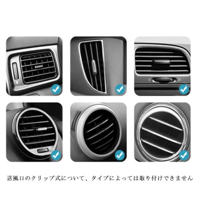 | 吸盤式とクリップ式車用携帯スタンド! 思い通りに角度や向きを調整でき、スマホの画面をもっと見やすいです。 クリップ式で送風口に取り付けて視界を遮らなく、エアコンの冷気でスマホも冷却してくれる。 片手でも操作できるので便利です。 挟むところが丈夫で落ちない、運転の邪魔はしない。 iphone,sony,huawei,samsungなどのメインストリーム機種で使用可能です。 | |