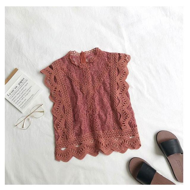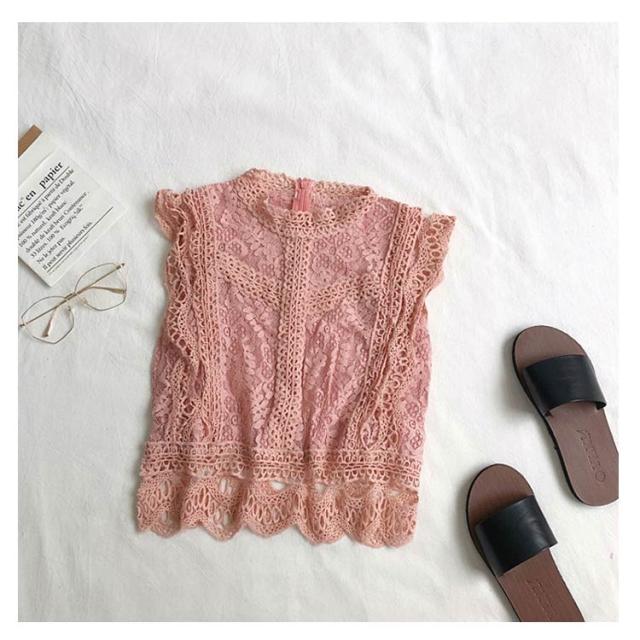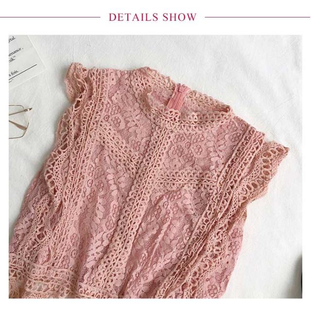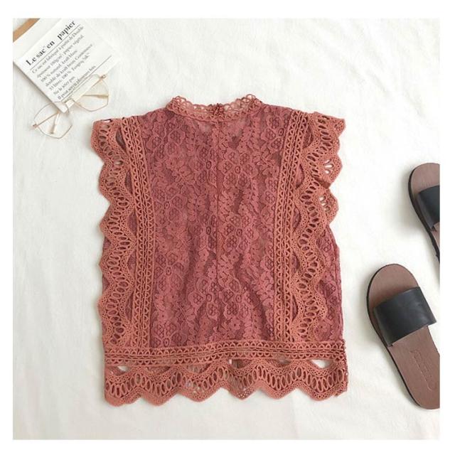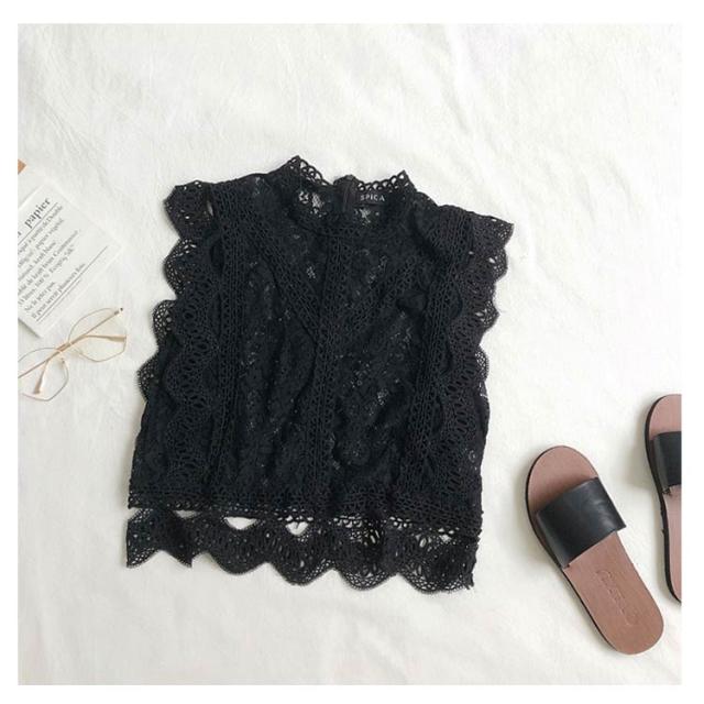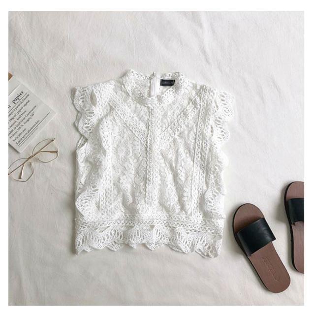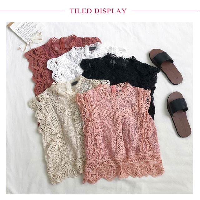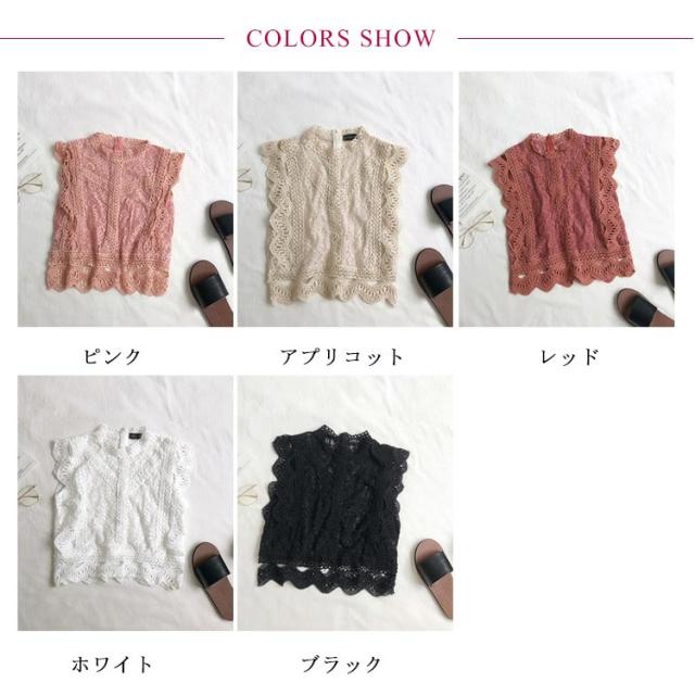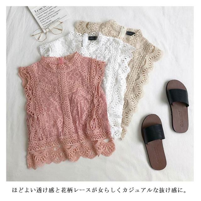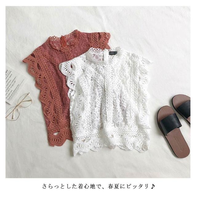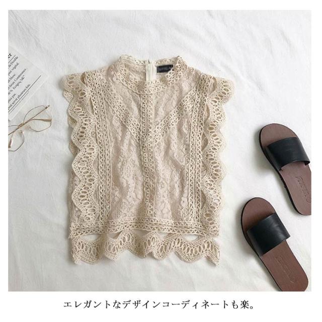 総レース ノースリーブブラウス タンクトップ レディース 花柄レース ブラウス フリル袖 ハイネック Uネック 薄手 涼しい 透かし 花柄レース トップス