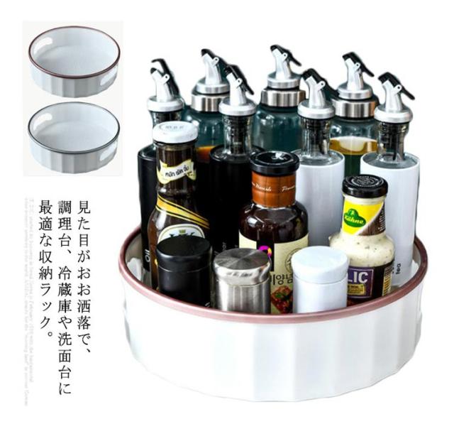 調味料ラック 360度回転式 丸型 調味料トレイ キッチン収納 卓上収納 台所 滑り止め 調味料置き スパイスラック 楽チン取り出し 大容量 収納ラック 洗面所 果物入れ 収納スタンド 2点セット