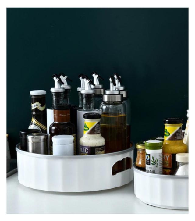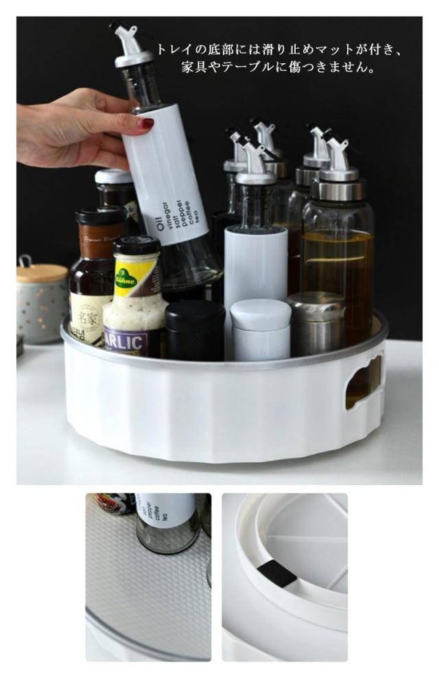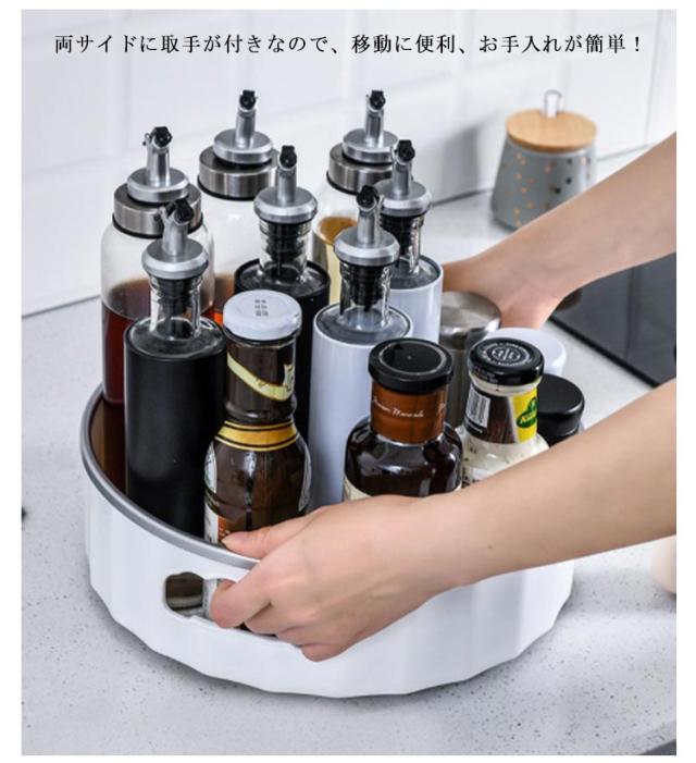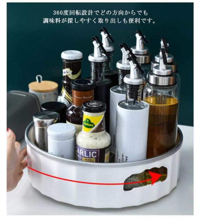 | 見た目がおお洒落で、調理台、冷蔵庫や洗面台に最適な収納ラック。 360度回転設計でどの方向からでも調味料が探しやすく取り出しも便利です。 両サイドに取手が付きなので、移動に便利、お手入れが簡単! トレイの底部には滑り止めマットが付き、家具やテーブルに傷つきません。 卓上収納、冷蔵庫収納、キッチン収納、果物入れなどに最適です。 | |