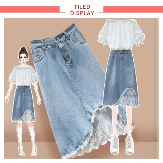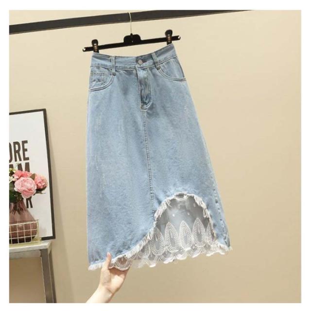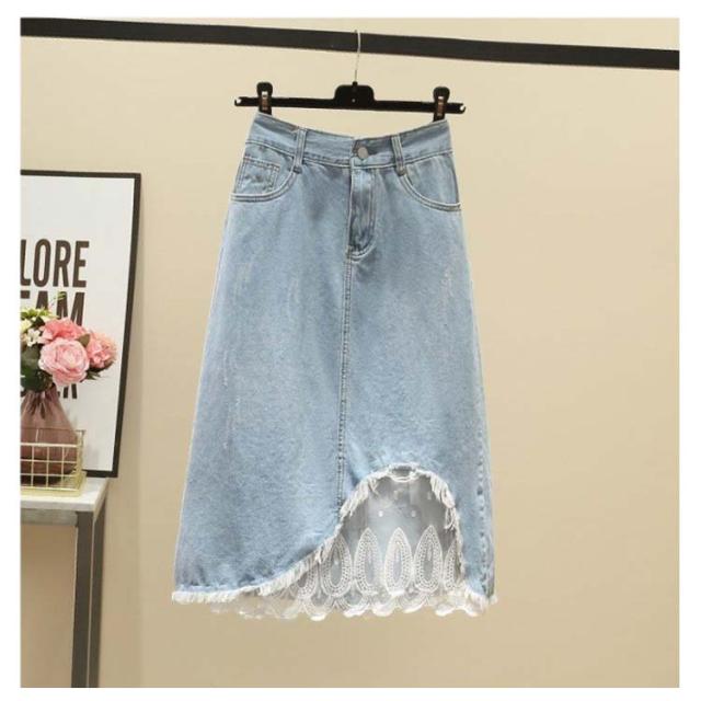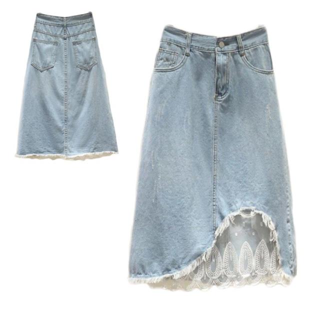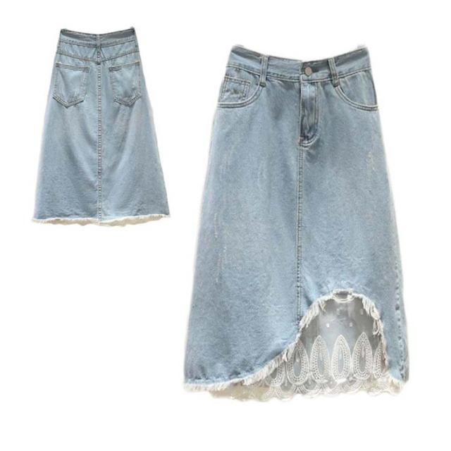 レディース スカート デニムスカート 夏 レーススカート ロングスカート 大きサイズ 切り替え ハイウエスト 着痩せ ミディアム丈 Aライン 無地 送料無料 おしゃれ シンプル カジュアル