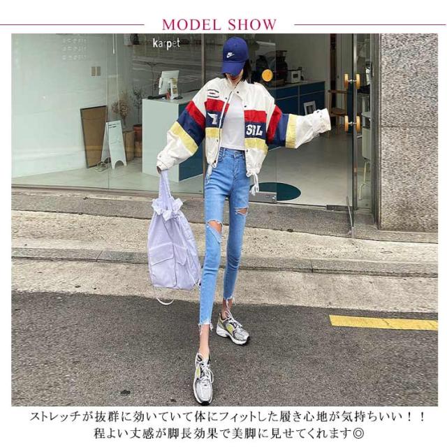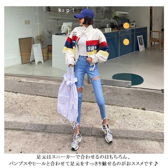 | 裾のカットオフがトレンドのダメージスキニーパンツが登場しました。 ストレッチが抜群に効いていて体にフィットした履き心地が気持ちいい!! 程よい丈感が脚長効果で美脚に見せてくれます◎ どんなトップスとも相性抜群のデニム生地で服を選ばずにこなれ感を演出でき、オシャレ上級者になれる必見アイテム。 足元はスニーカーで合わせるのはもちろん、パンプスやヒールと合わせて足元をすっきり魅せるのがおススメです♪ | |