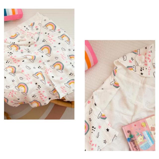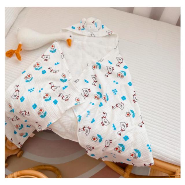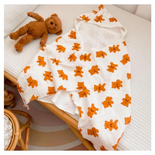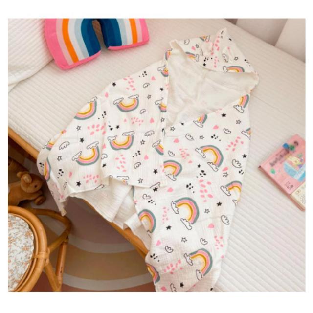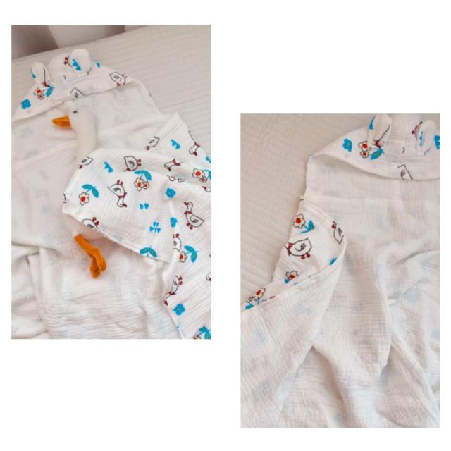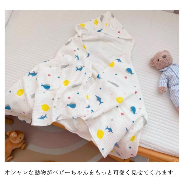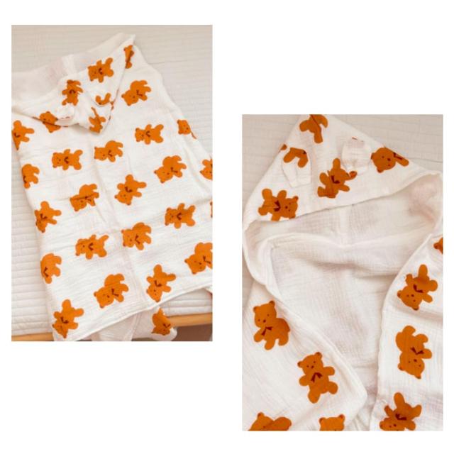 | お風呂上りやプールなどで活躍するフード付きタオル 4重ガーゼの暖かい素材でちょっとした保温にも便利に使ってます。 しっかり水分を吸収してくれるし、形も袖が無いので着せやすい 。 オシャレな動物がベビーちゃんをもっと可愛く見せてくれます。 お風呂上がりだけでなくルームウェア・羽織るガウンとしても着られます。 | |