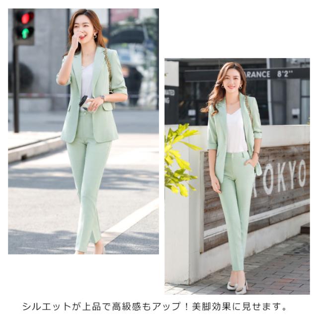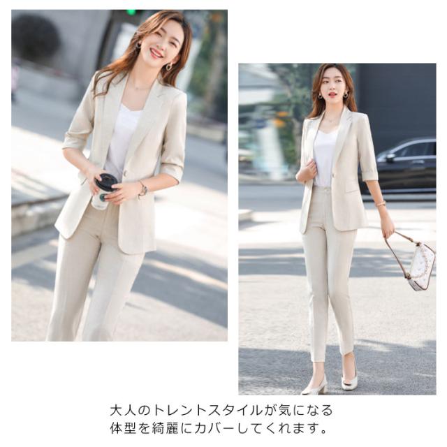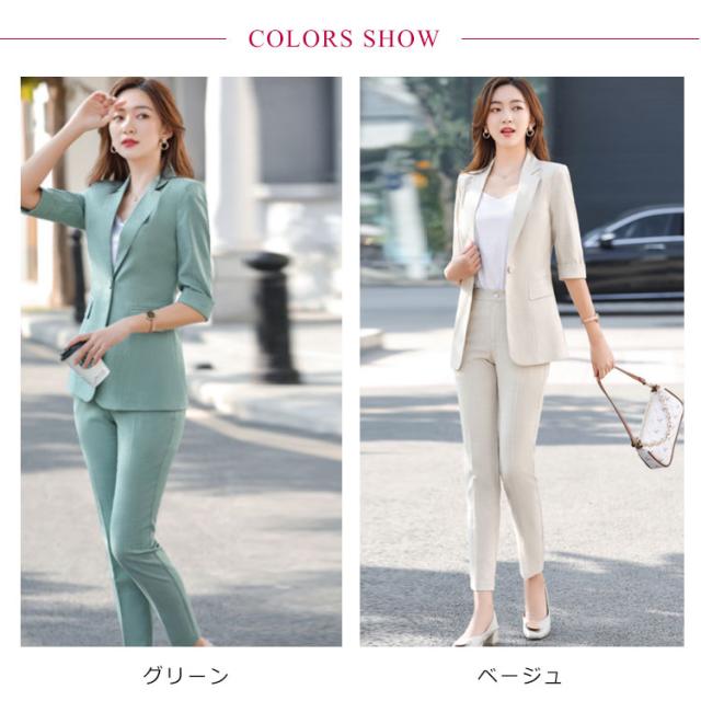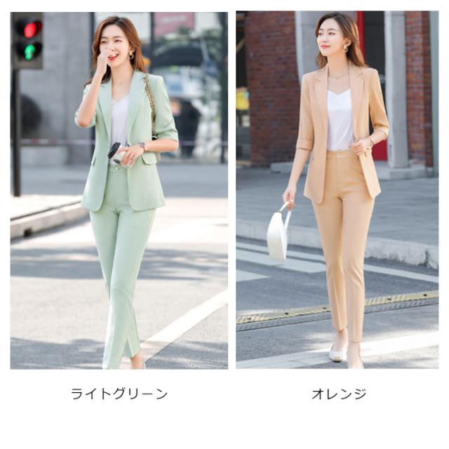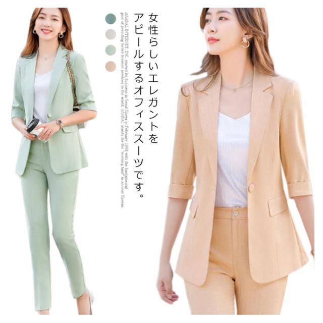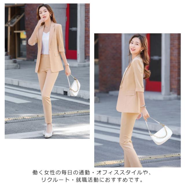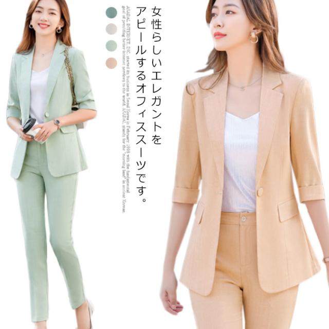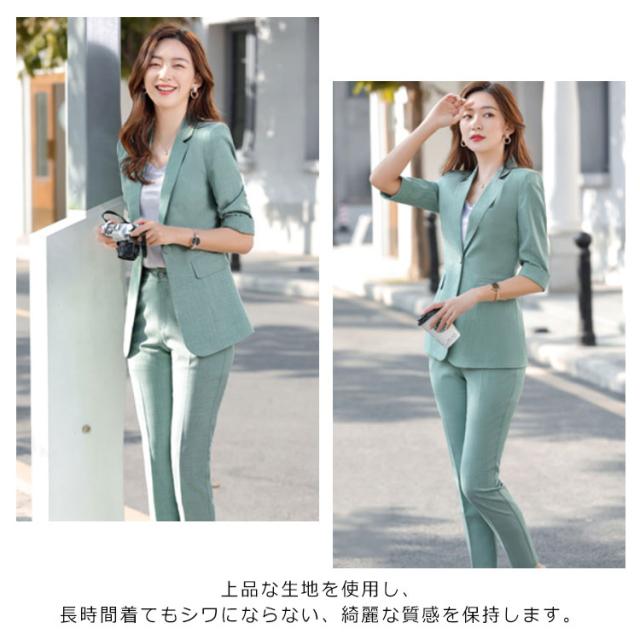 オフィススーツ パンツスーツ 上下セット 2点セット ロングパンツ スーツセット フォマール レディース OL 通勤 キレイめ お洒落 5分袖 エレガント ビジネス 面接 大きいサイズ