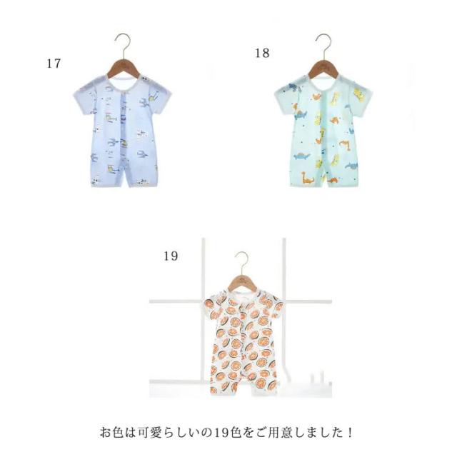 | 総柄の半袖カバーオール♪ お色は可愛らしいの19色をご用意しました! 丈夫でお肌に優しいコットン素材で、部屋着でもお出かけ着でも大活躍! 前開きで、着替えやおむつ替えに便利です。 | |