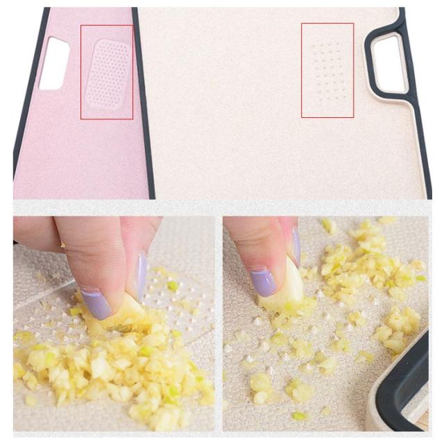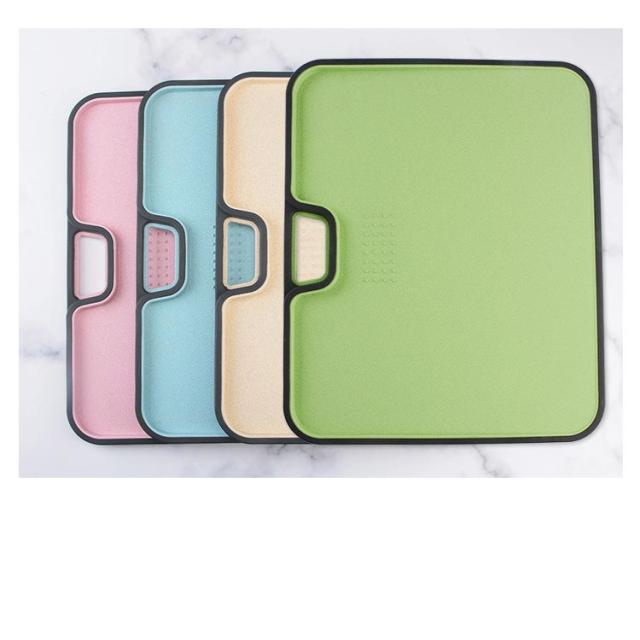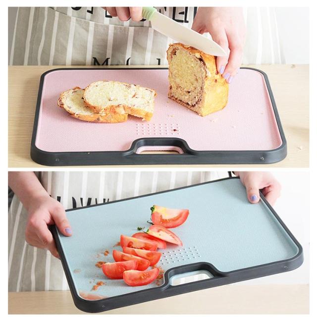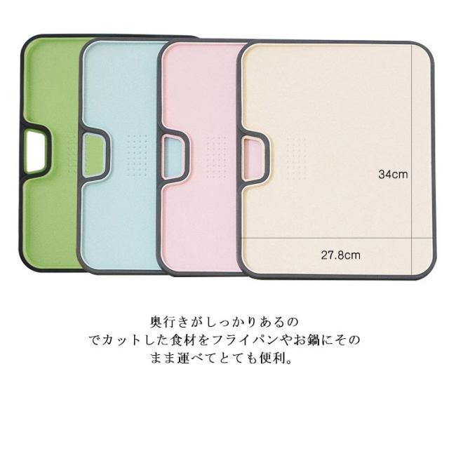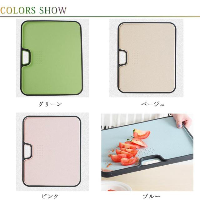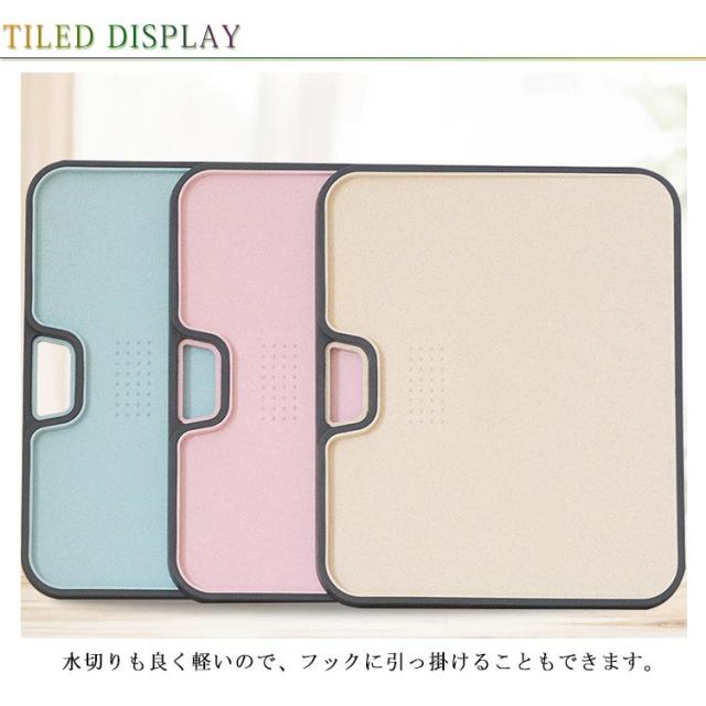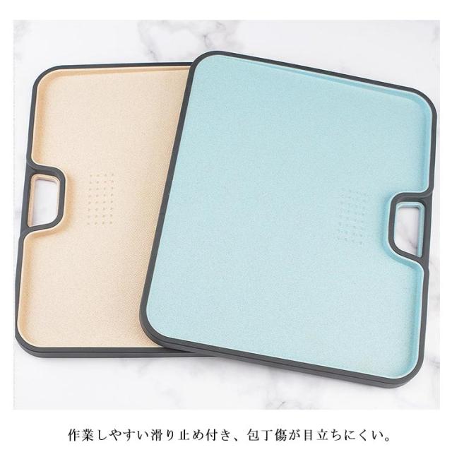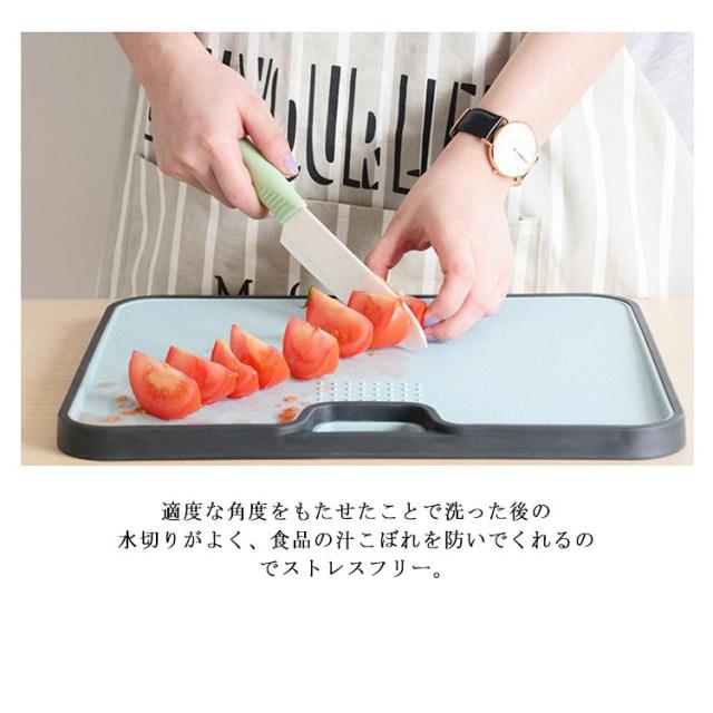 | 両面使用できるので生食と加工食で使い分けます。 水切りも良く軽いので、フックに引っ掛けることもできます。 作業しやすい滑り止め付き、包丁傷が目立ちにくい。 奥行きがしっかりあるのでカットした食材をフライパンやお鍋にそのまま運べてとても便利。 適度な角度をもたせたことで洗った後の水切りがよく、食品の汁こぼれを防いでくれるのでストレスフリー。 | |