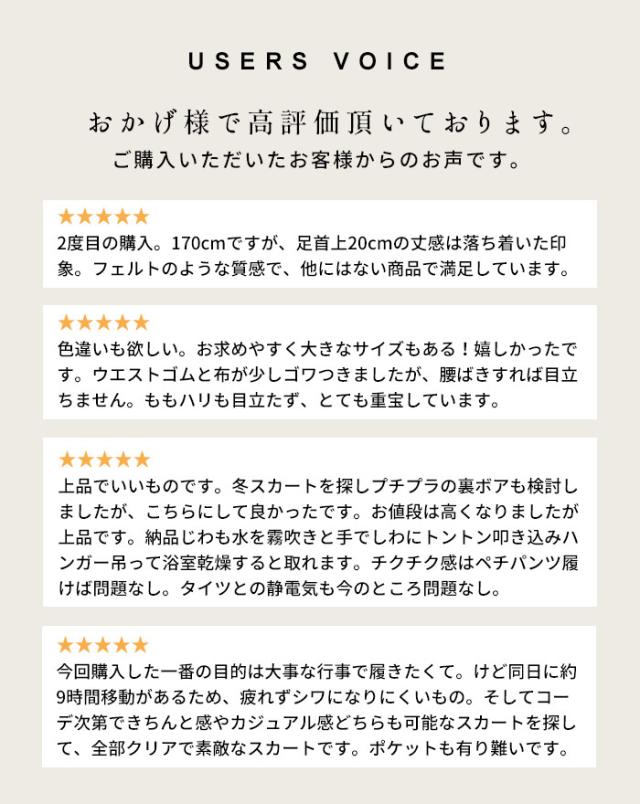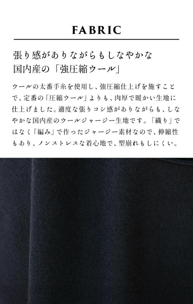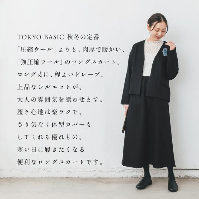 特徴 TOKYO BASIC 秋冬の定番「圧縮ウール」よりも、肉厚で暖かい、「強圧縮ウール」のロングスカート。ロング丈に、程よいドレープ、上品なシルエットが、大人の雰囲気を漂わせます。履き心地は楽ラクで、さり気なく体型カバーもしてくれる優れもの。寒い日に履きたくなる便利なロングスカートです。