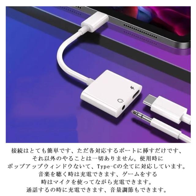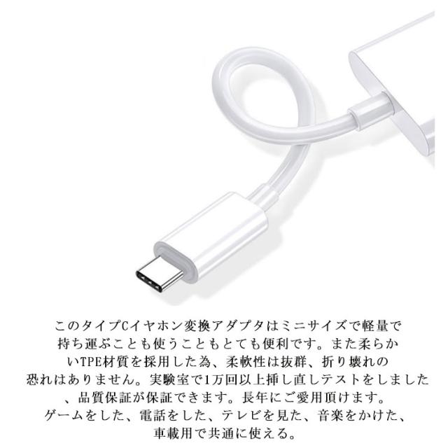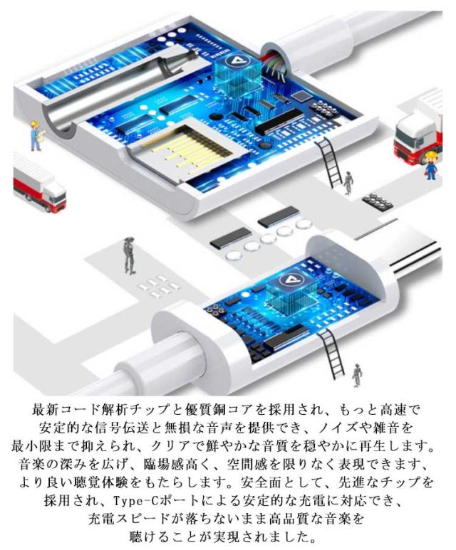 | 【イヤホン・充電同時】スマホ本体のType-C端子から3.5mmジャック+Type-C端子が同時に使用できる便利な2in 1多機能のタイプCイヤホン変換ケーブルです。電流のノイズがないので、この最新のType-C充電しながら、音楽再生を楽しめます。このType-Cイヤホン変換アダプターは通話機能をサポートできるだけではなく、イヤホンのマイクとボタン機能も使用できます。また、イヤホンのリモコンの再生/一時停止/曲送り/曲戻り/音量調節などすべての操作も対応できます。 【ノイズがない&転送快速】最新コード解析チップと優質銅コアを採用され、もっと高速で安定的な信号伝送と無損な音声を提供でき、ノイズや雑音を最小限まで抑えられ、クリアで鮮やかな音質を穏やかに再生します。音楽の深みを広げ、臨場感高く、空間感を限りなく表現できます、より良い聴覚体験をもたらします。安全面として、先進なチップを採用され、Type-Cポートによる安定的な充電に対応でき、充電スピードが落ちないまま高品質な音楽を聴けることが実現されました。 【接続簡単】接続はとても簡単です、ただ各対応するポートに挿すだけです、それ以外のやることは一切ありません。使用時にポップアップウィンドウないて、Type-Cの全てに対応しています。音楽を聴く時は充電できます、ゲームをする時はマイクを使ってながら充電できます。通話するの時に充電できます、音量調節もできます。 【優れた携帯性&耐久性】このタイプCイヤホン変換アダプタはミニサイズで軽量で持ち運ぶことも使うこともとても便利です。また柔らかいTPE材質を採用した為、柔軟性は抜群、折り壊れの恐れはありません。実験室で1万回以上挿し直しテストをしました、品質保証が保証できます。長年にご愛用頂けます。 ゲームをした、電話をした、テレビを見た、音楽をかけた、車載用で共通に使える。 | |