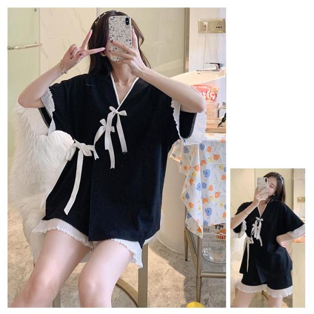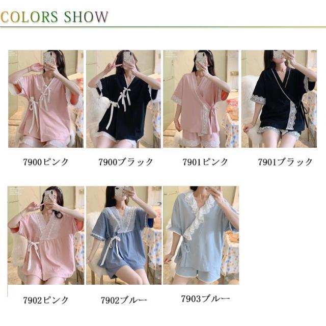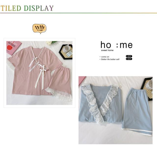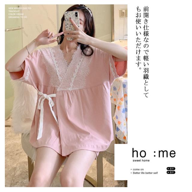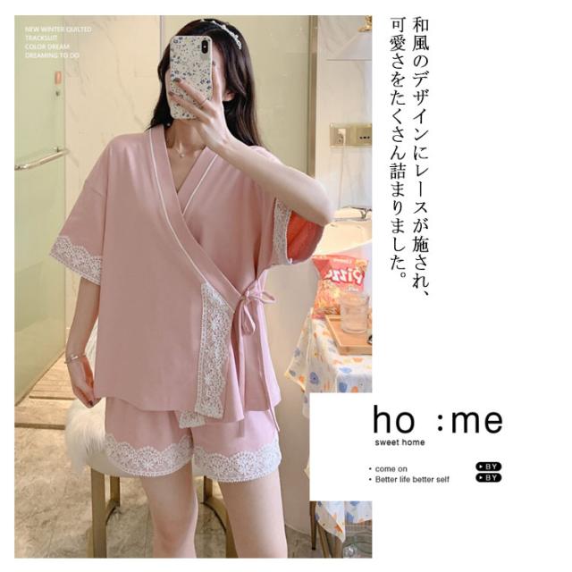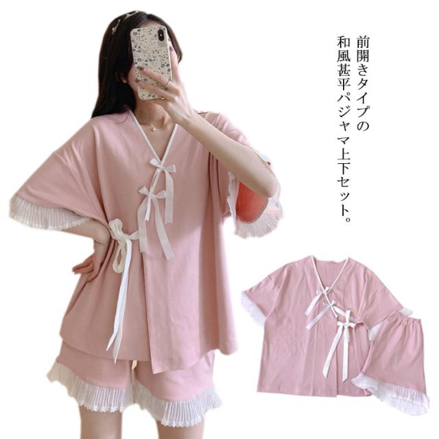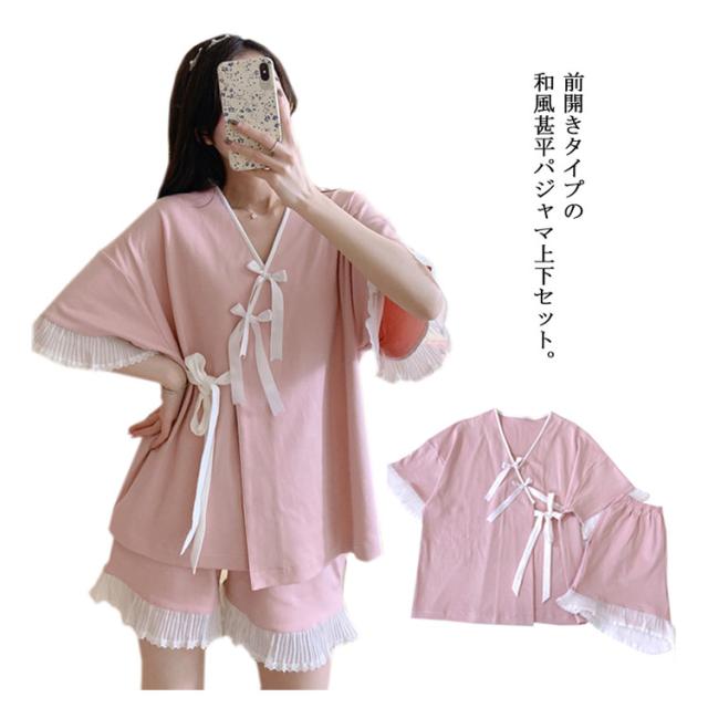 【送料無料】ルームウェア パジャマ 甚平 半袖 上下セット 2点セット 寝巻き 浴衣 和風パジャマ ルームウェア レディース 部屋着 ゆったり 涼しい 通気性抜群 前開き レース リボン 柔らかい じんべい ジンベイ