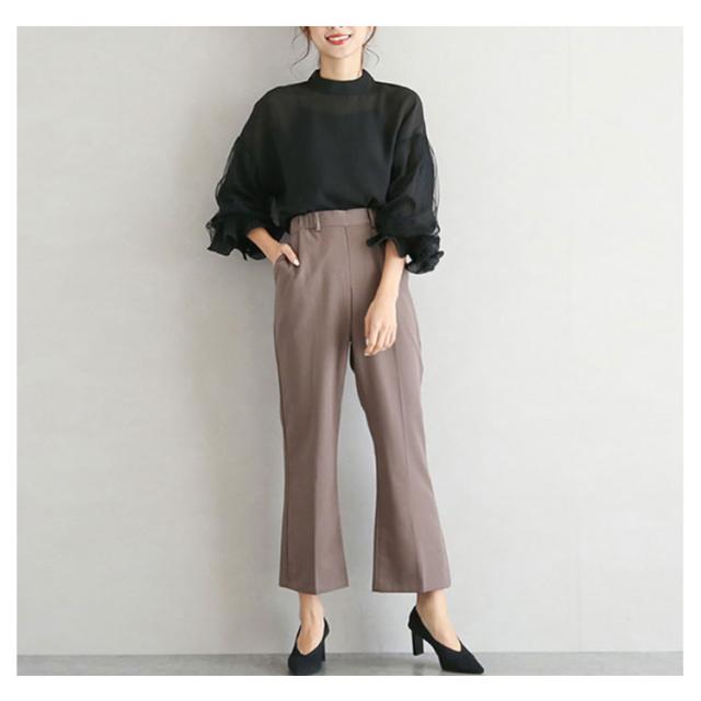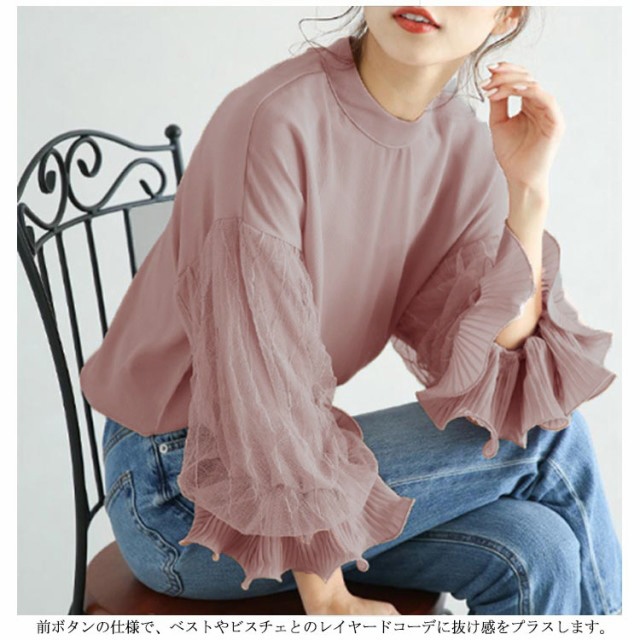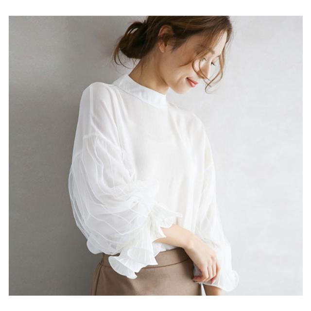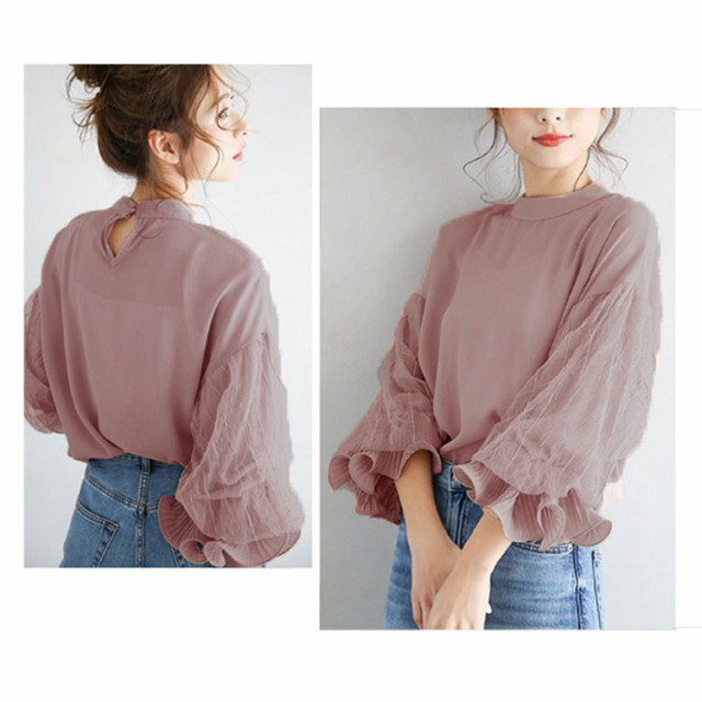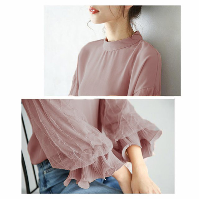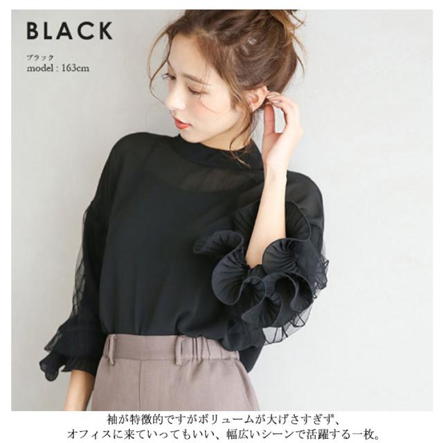 光沢感のあるブラウス シャツ トップス レディース 送料無料 バルーン袖 バンドカラー ミドル丈 長袖 ぽわん袖 ボリュームスリーブ ギャザー ストレッチ オフィスカジュアル きれいめ 大人 無地 オフィス 通勤