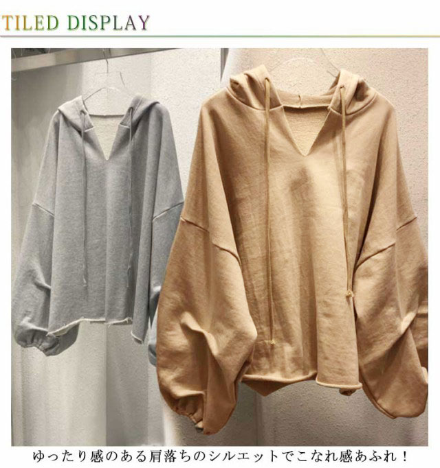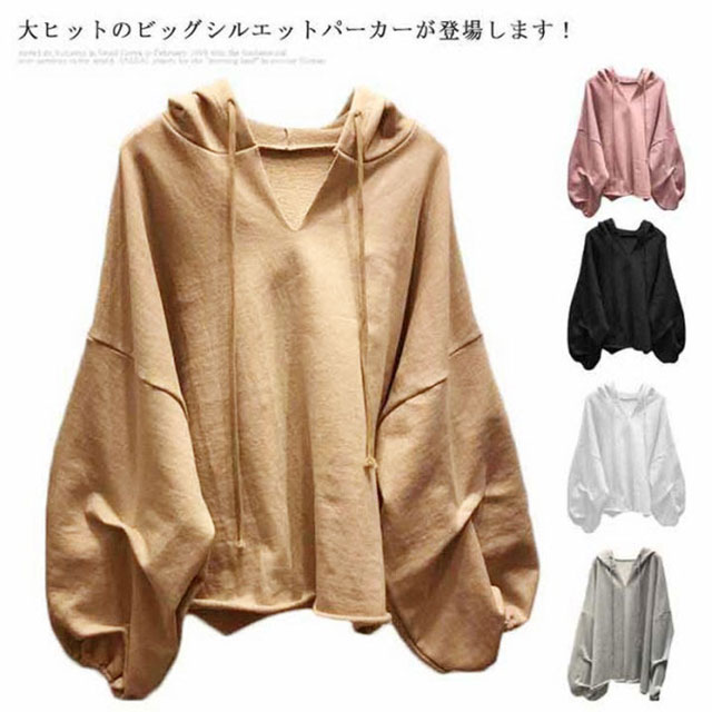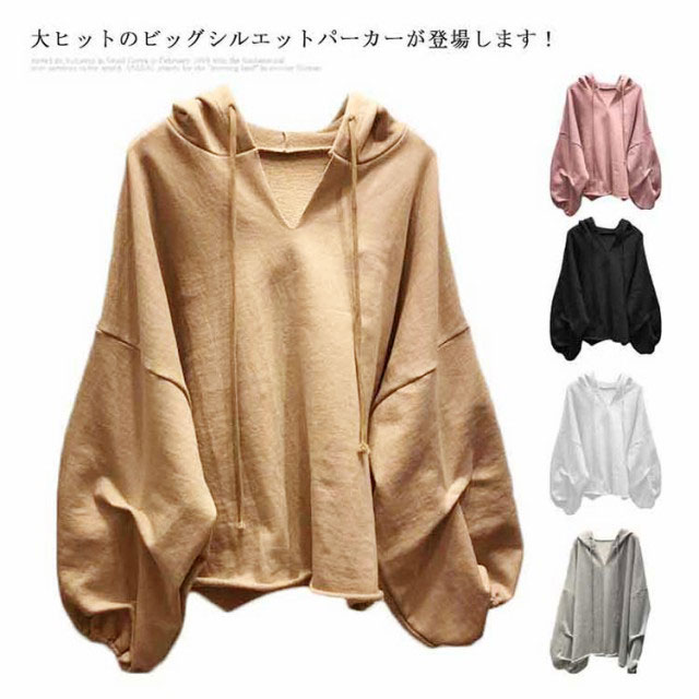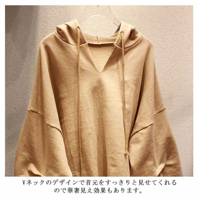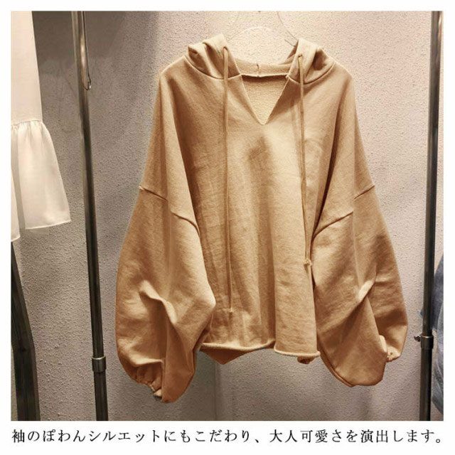 (送料無料)パーカー レディース 春 Vネック フード付き 大きめ プルオーバー トレーナー スウェット ルームウェア バルーン袖 くすみカラー ビッグパーカー ビッグシルエット 大きいサイズ ゆったり
