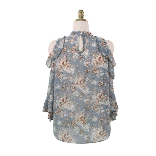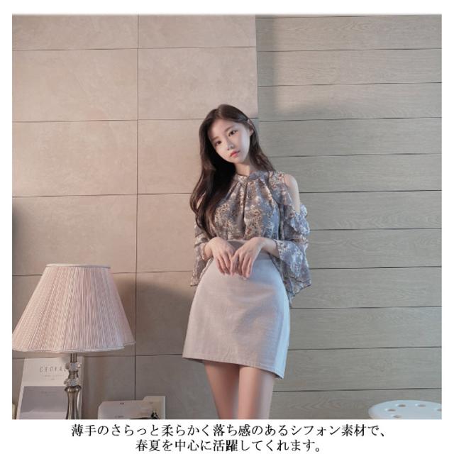 | 肩部分が開いたきれいめ風デザインの花柄ブラウス。 袖口にもフリルが施されており可愛さがたくさん詰まった。 薄手のさらっと柔らかく落ち感のあるシフォン素材で、春夏を中心に活躍してくれます。 デイリー使いから、ちょっとしたお出かけにもぴったり! ミニスカートやショートパンツで甘めに仕上げます。 | |