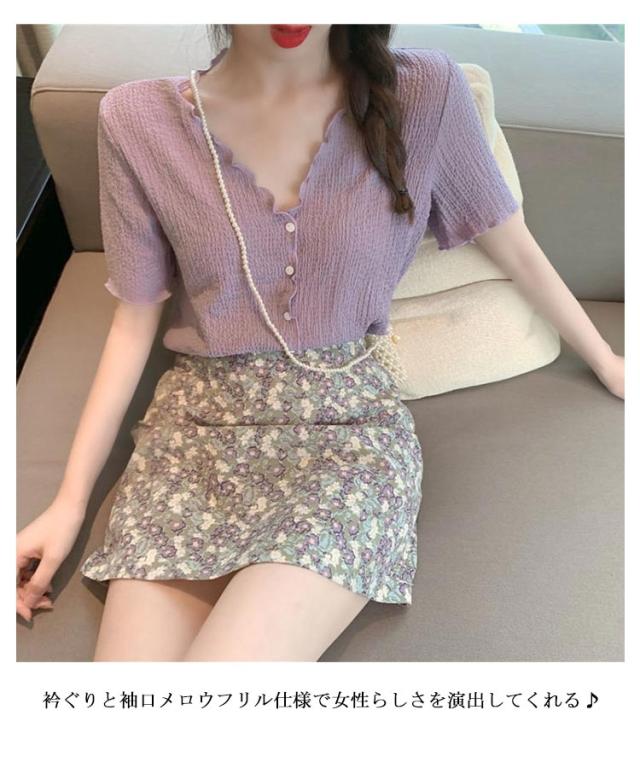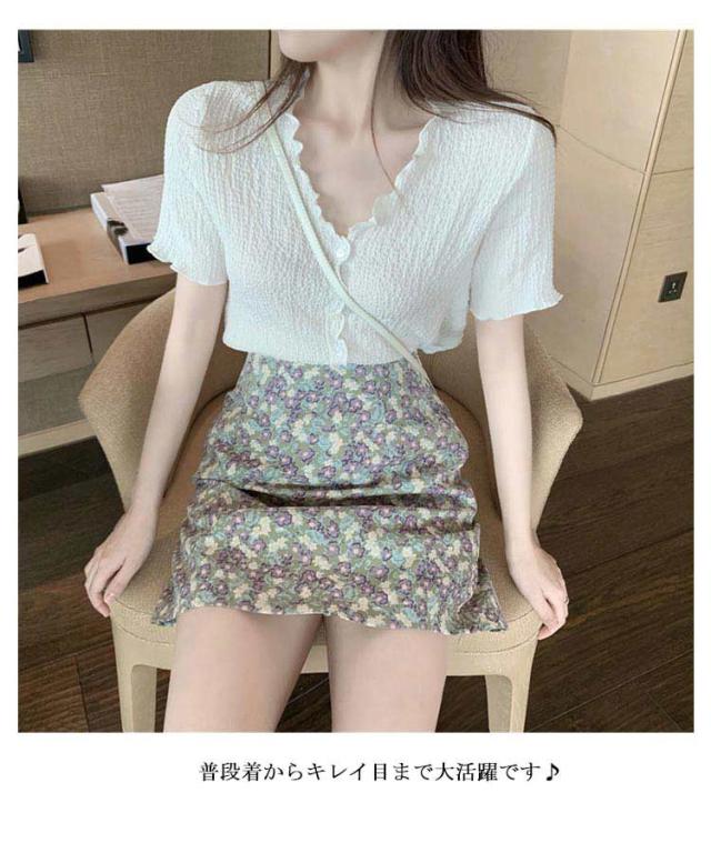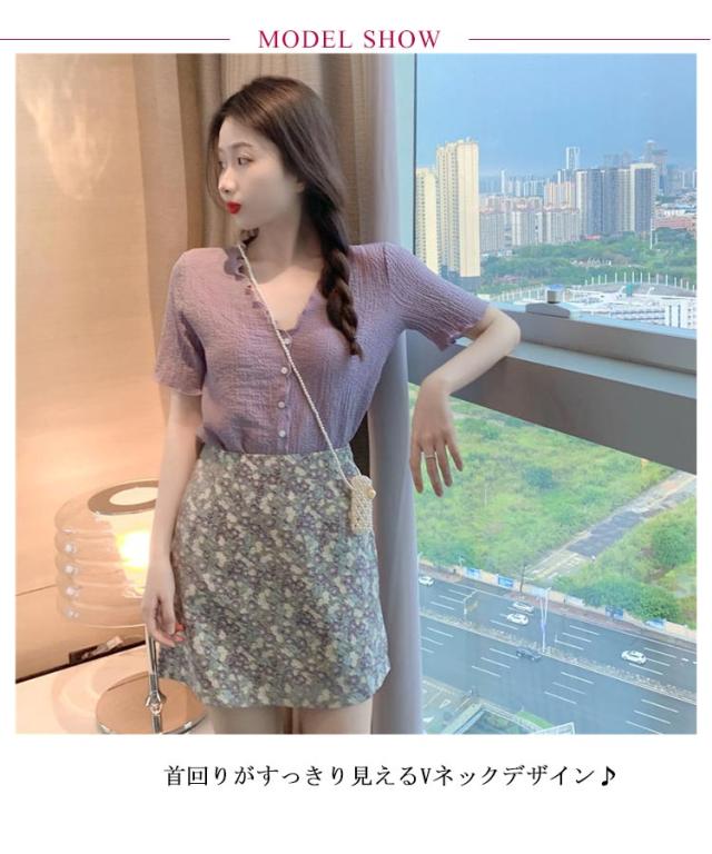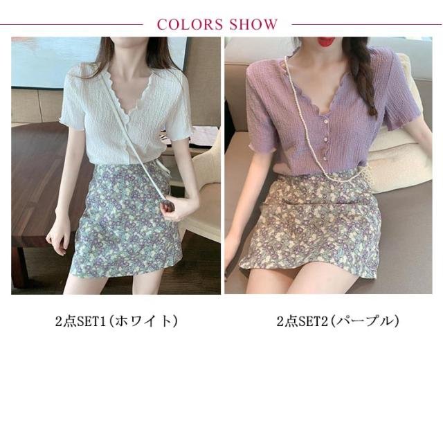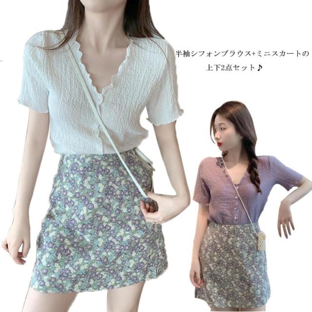 セットアップ 半袖 シフォンブラウス ミニスカート レディース Vネック トップス 前開き ボトムス スカート 上下2点セット メロウフリル 皴 しわ 無地 小花柄 おしゃれ 可愛い キレイ目 カジュアル