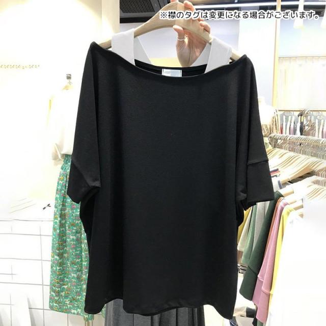 カットソー Tシャツ 半袖 レディース 女性用 トップス フェイクレイヤード 重ね着風 ドロップショルダー オフショルダー 肩出し バイカラー シンプ