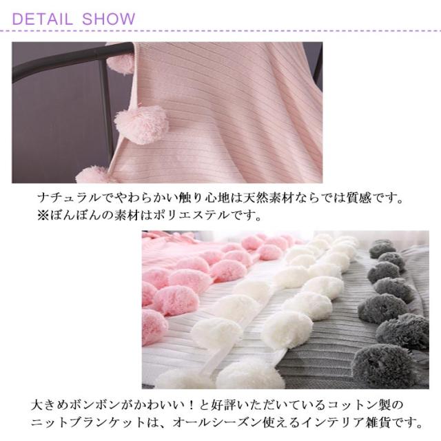 | 150センチ×200センチの大判ブランケットは、シングルサイズのベッドカバーやベッドスローにピッタリなサイズ感のマルチカバーとしても使っていただけます。 大きめボンボンがかわいい!と好評いただいているコットン製のニットブランケットは、オールシーズン使えるインテリア雑貨です。 ベッドランナーやベットカバーの他にもソファーやソファベッドに ソファカバーとしてかけるだけで絵になる大きいぽんぽんフリンジ付のフリークロスです。 無地と同じように使えるから、リビングのソファ掛けとして、またダイニングのベンチチェアにニットスローを敷くだけでファミリーのくつろぎ時間がワンランクアップ! シンプルなデザインは子供部屋や書斎のチェアカバーなど洋室、和室を問わず使えます。 ハイゲージのシングル毛布は、デリケートなお肌にやさしい綿100%です。 ナチュラルでやわらかい触り心地は天然素材ならでは質感です。 ※ぼんぼんの素材はポリエステルです。 手編みのように優しい雰囲気のスローケットはベビーフォト用の小道具にも人気♪ ベビーバスケットや赤ちゃん布団に敷くだけで、映えるお昼寝アート用に使えます。 | |
