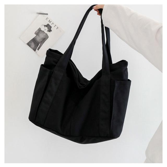 | シンプルなデザインで、内部は布地の挿入袋と袋を大きくして、シンプルで裏地のないデザインは更に乱れが現れません。 外側4つ+内側1つの5ポケットでさっと出したいものが分けられてとっても便利。 習い事や荷物の多いママさんや一泊旅行・ジムバッグとしても大活躍です。 | |