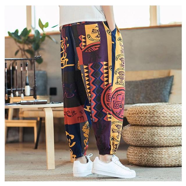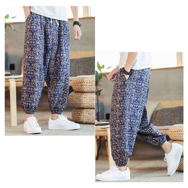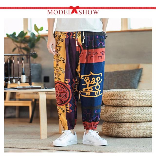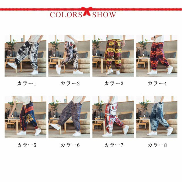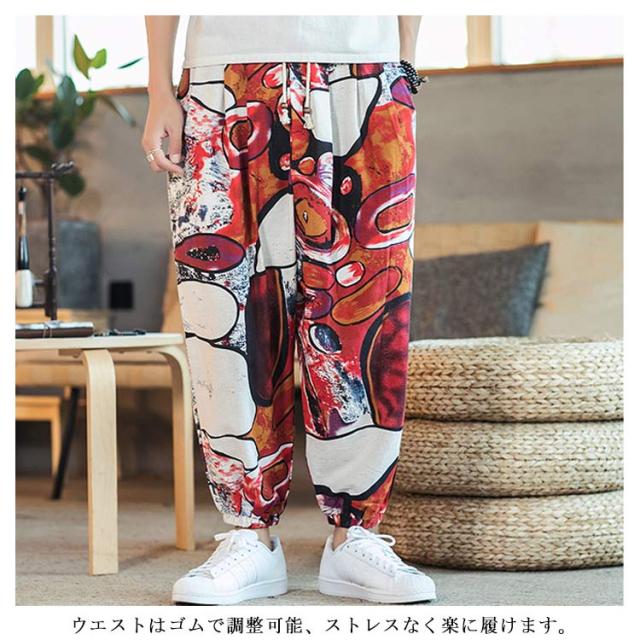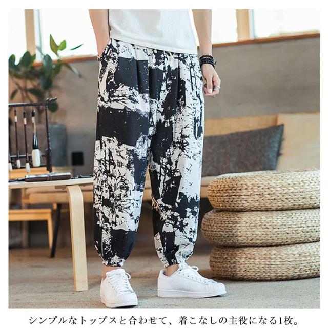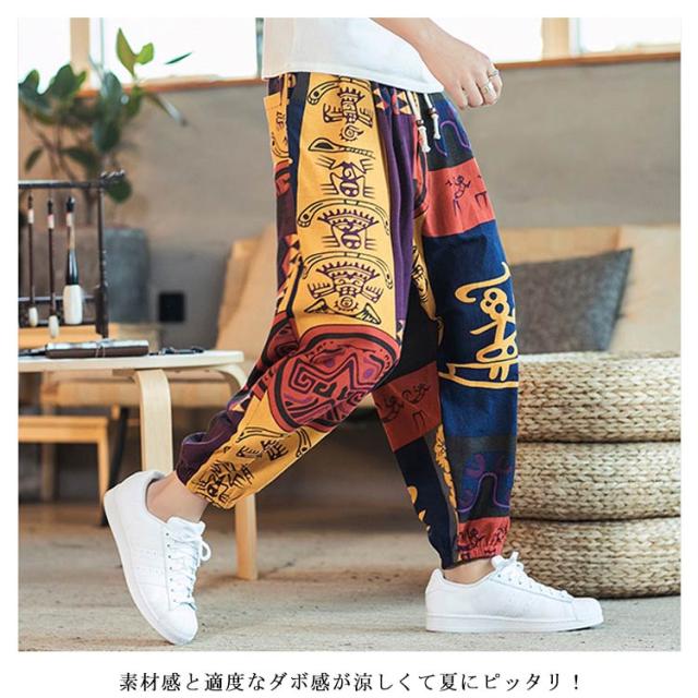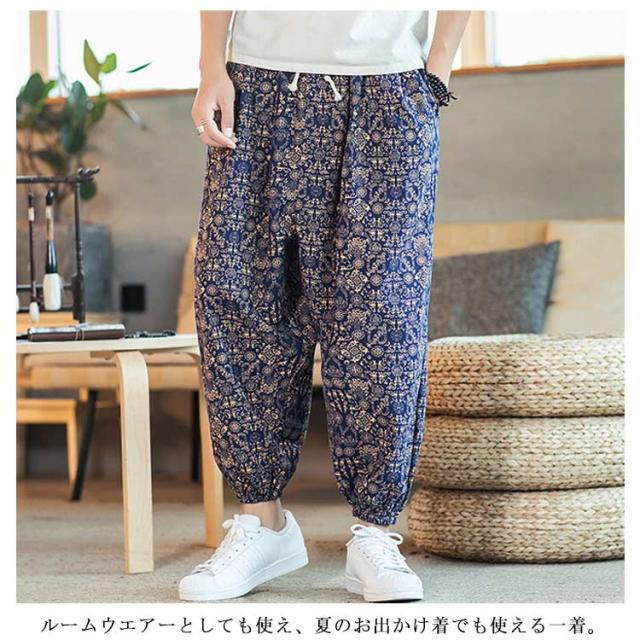 サルエルパンツ クロップドパンツ リネン パンツ 7分丈 9分丈 アラジンパンツ タイパンツ メンズ ボトムス オーバーサイズ エスニック 幾何学柄 薄手 綿麻 カジュアル コーデ ゆったり 送料無料 敬老の日