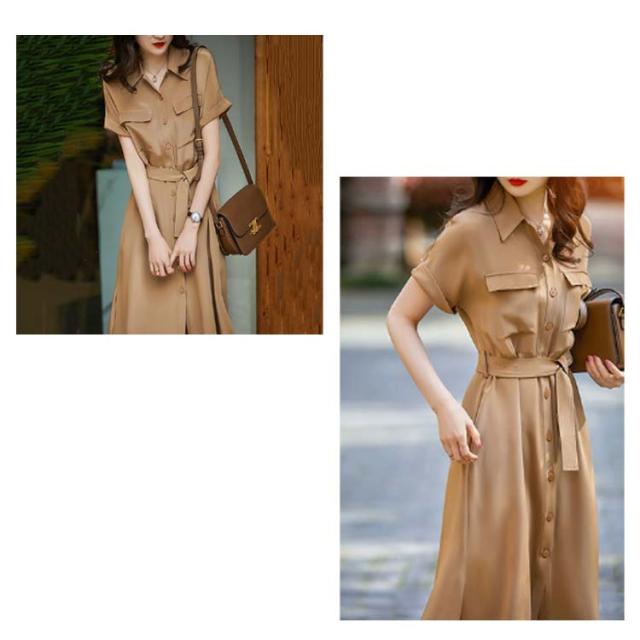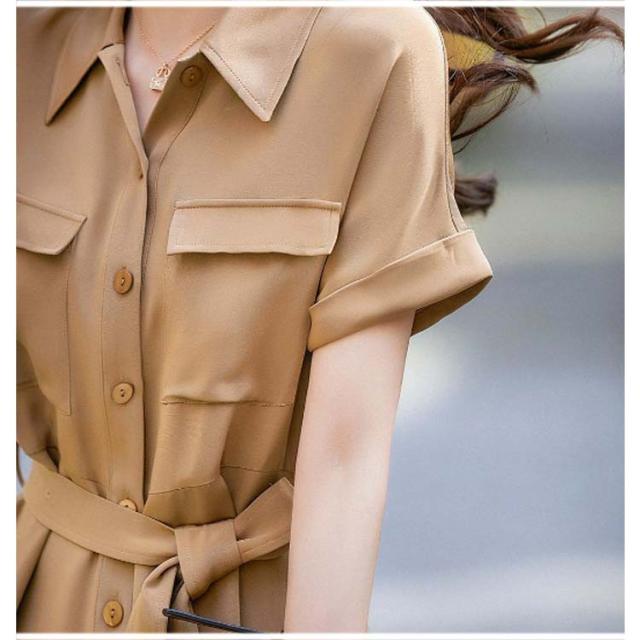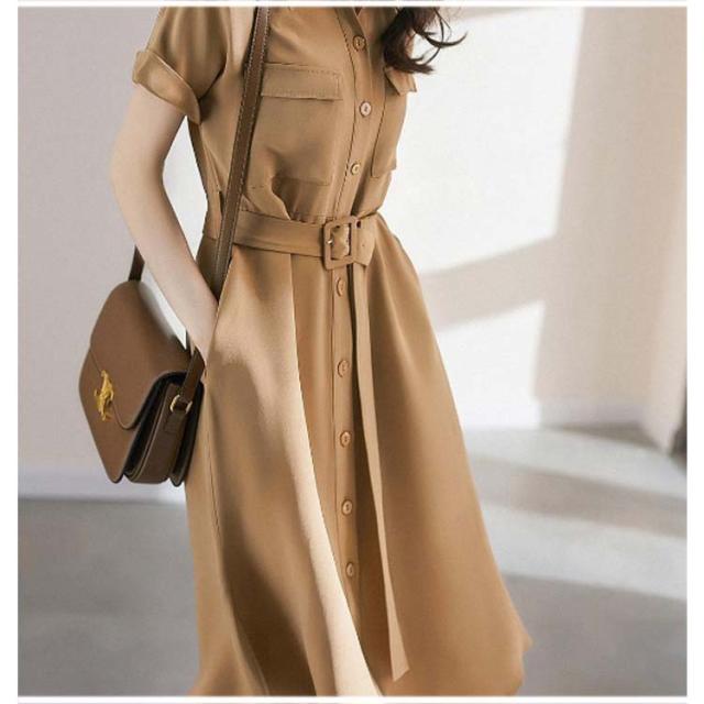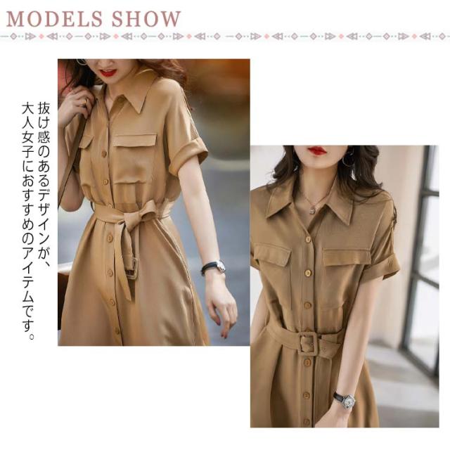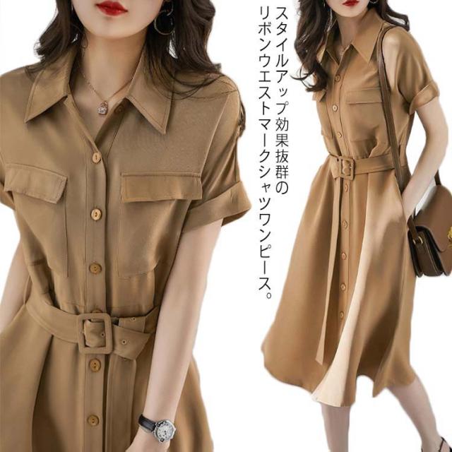 シャツワンピース 半袖 Aライン レディース ワンピース パフスリーブ 膝下丈 vネック ロング丈 マキシワンピース 夏 きれいめ ゆったり 体型カバー 高級感 通気 無地 優雅 着? 通勤 おしゃれ 上品 送料無料