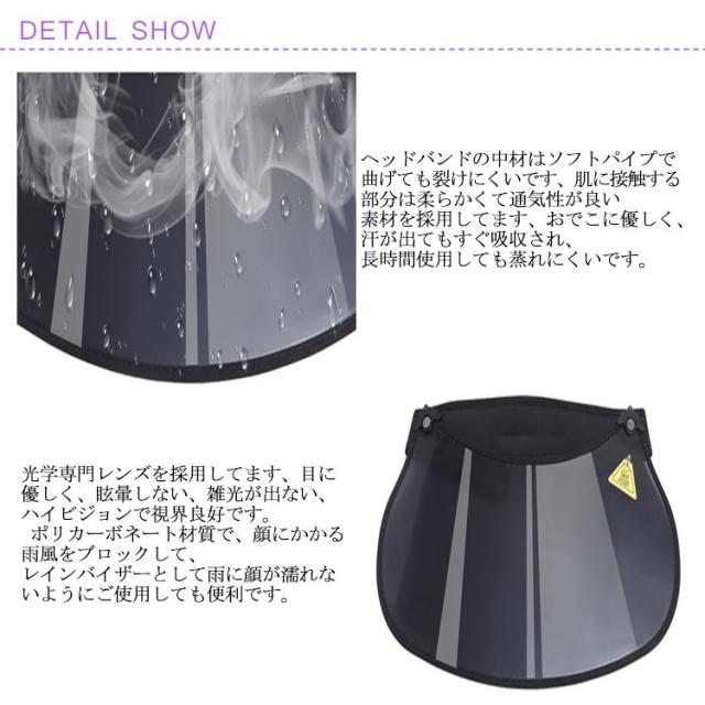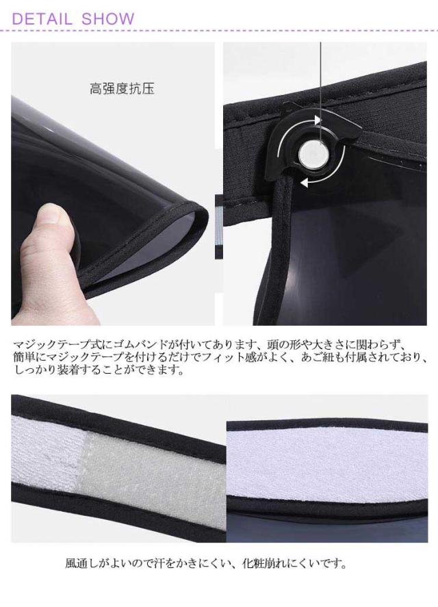 | 【UPF50+、UVカット率99%以上】UPF50+(紫外線保護指数50+)と認定されたプロ級UVカット製品、肌を傷める紫外線の99%以上カット!皮膚に有害な紫外線などをちゃんとカットしてお肌を守ります、強い日射しでも、お肌がダメージされる心配はありません。日々のお出かけや、通勤、通学、自転車乗り、ガーデニング、スポーツ観戦、クライミング、サイクリング、ゴルフ、山登り、お釣り、旅行、レジャーなどにサンバイザーとして大活躍。 【通気性がよい】つばは紫外線カット加工されている高品質専門レンズを採用してます、表面は擦り傷防止技術で強化され、傷つきにくいです。ヘッドバンドの中材はソフトパイプで曲げても裂けにくいです、肌に接触する部分は柔らかくて通気性が良い素材を採用してます、おでこに優しく、汗が出てもすぐ吸収され、長時間使用しても蒸れにくいです。 【サイズ調節可能】マジックテープ式にゴムバンドが付いてあります、頭の形や大きさに関わらず、簡単にマジックテープを付けるだけでフィット感がよく、あご紐も付属されており、しっかり装着することができます。つば広いタイプで、視界をさえぎらずに紫外線をカットしてお耳までお顔の全体を守ります。 【360°つば角度調整可能】回転ボタンは階段調整付きで片手で360°つばの角度を調節できます、太陽や雨、風の状況によってつばの角度を自由に変えられます、不要の時はつばを上げて固定すればオケです。風通しがよいので汗をかきにくい、化粧崩れにくいです。 【視界良好&晴雨兼用】光学専門レンズを採用してます、目に優しく、眩暈しない、雑光が出ない、ハイビジョンで視界良好です。 ポリカーボネート材質で、顔にかかる雨風をブロックして、レインバイザーとして雨に顔が濡れないようにご使用しても便利です。 【使用注意】傷付き防止のため、保護シールがつば部の表と裏の全面に貼ってあります、ご使用する前に必ず両面剥がしてください。 | |