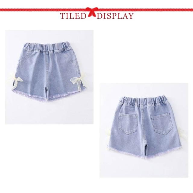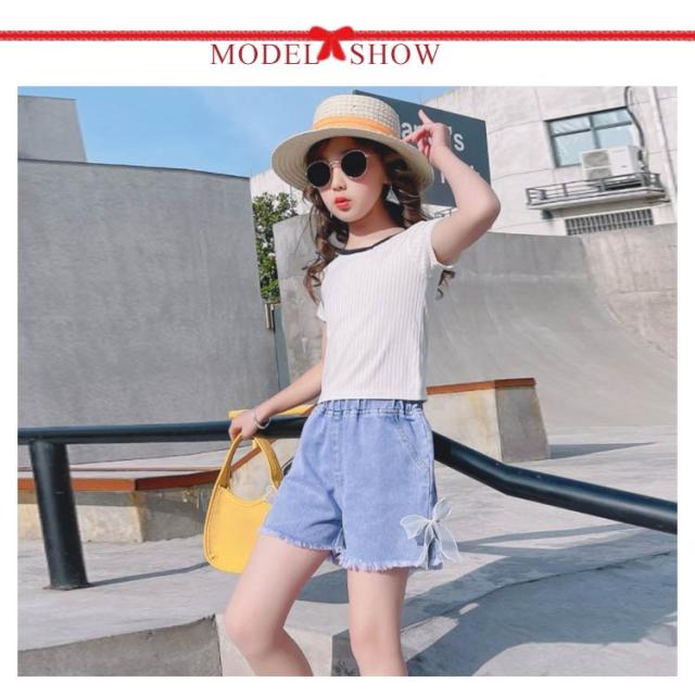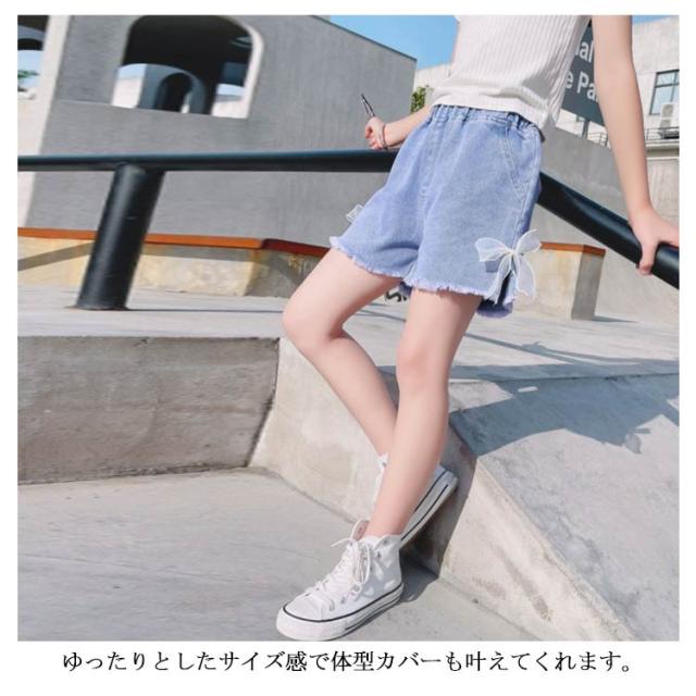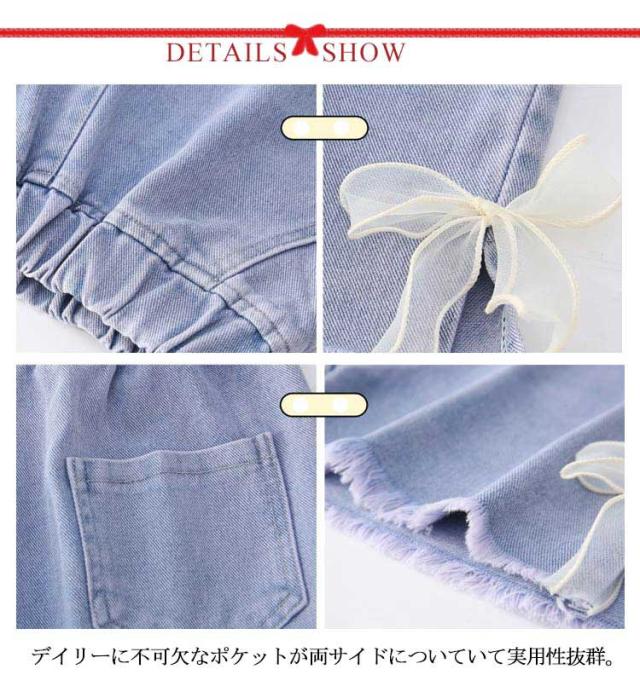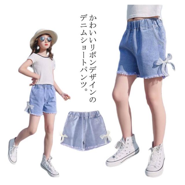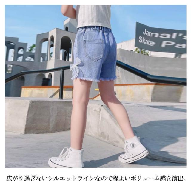 ジュニア デニム ショート パンツ ジーパン 薄手 サイドスリット リボン 女の子 ガールズ 可愛い 小学生 ダンス 子供服 送料無料 ヒップホップ 韓国 ファッション 春 夏 かわいい おしゃれ カジュアル こども キッズ 子ども デニムパンツ